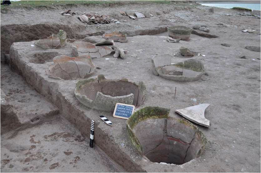 Η ανασκαφή έφερε στο φως τμήματα υπόγειων ή ισόγειων χώρων που αποτελούσαν αποθηκευτικούς χώρους μεγάλων, διώροφων πιθανόν κτισμάτων καθώς και ισόγεια κτίσματα με εστίες στο εσωτερικό τους. Το νεότερο κτίσμα καταστράφηκε ξαφνικά, πιθανόν από σεισμό, στα μέσα του 2ου αι. π.Χ. Στο στρώμα καταστροφής του, εκτός από τα πιθάρια που βρέθηκαν τοποθετημένα σε λάκκους ανοιγμένους στο φυσικό ή σε πρωιμότερα στρώματα κατοίκησης, βρέθηκαν και πολλά μεγάλα αγγεία, κάποια πεσμένα από τον πάνω όροφο (εικ. 6).