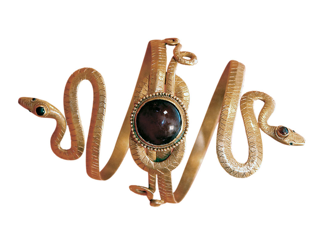 Το βραχιόλι (ψέλλιο), επίσης χρυσό, σχηματίζεται από φίδια που συμπλέκονται περίτεχνα μεταξύ τους για να δώσουν τον λεγόμενο κόμβο του Ηρακλή (Ηράκλειον άμμα), ενώ κοσμείται με ερυθρό ημιπολύτιμο λίθο.