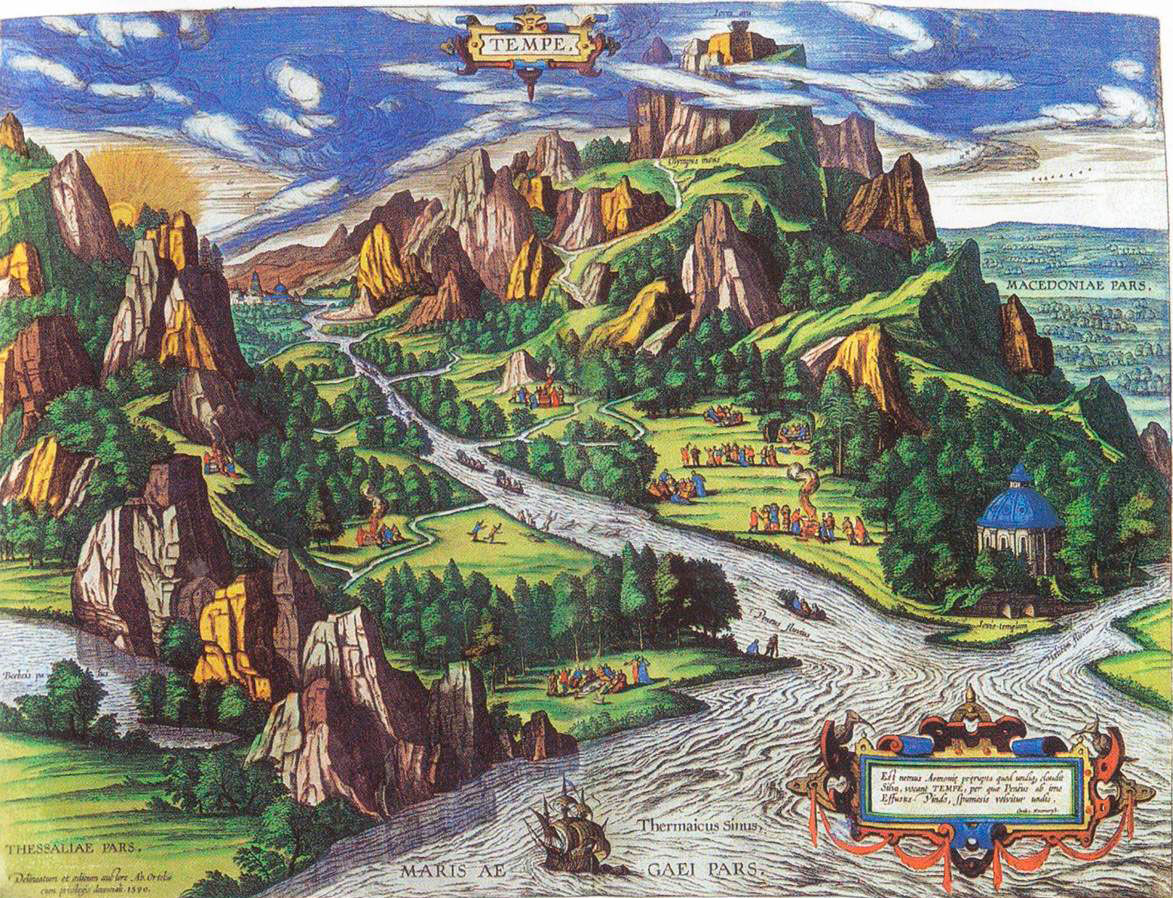 Ο Ολλανδός ζωγράφος και χαρτογράφος Abraham Ortelius έγραψε το 1595 (σημ. 6): «Στα Τέμπη η φύση σκόρπισε σπάταλα όλα της τα δώρα: ορεινούς όγκους, πλαγιές, γκρεμούς, ανάβρες γάργαρες και δροσερές, οι οποίες πιδακίζουν από τις βραχότρυπες, χλωρίδα πολυποίκιλη με αμέτρητες τις αποχρώσεις του πράσινου, δένδρα πανύψηλα και αιωνόβια και στο μέσον ένα ποτάμι μυθικό, που κυλάει τα θολά νερά του ήρεμα, αθόρυβα και ασταμάτητα» (εικ. 2).