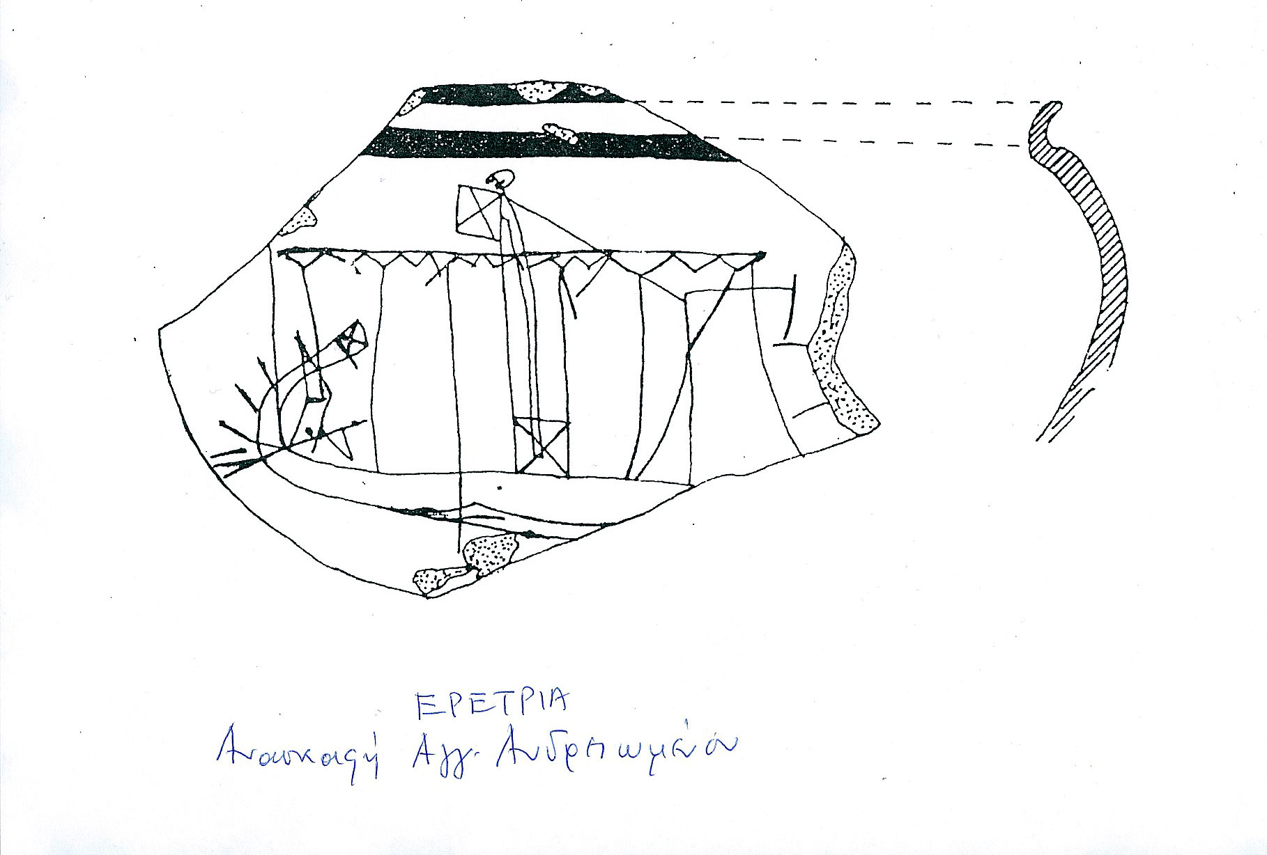 Άξιο μνείας είναι το αριθ. 3121 θραύσμα από υστερογεωμετρικό σκύφο που βρέθηκε στην Ερέτρια και το οποίο φέρει χάραγμα (graffito) πλοίου ιστιοφόρου, τα ιστία του οποίου αναδιπλώνονται γύρω από τον ιστό (κατάρτι). Αριστερά διακρίνεται το πηδάλιο και στον κεντρικό ιστό μάλλον το σήμα του πλοίου (σημ. 20) (εικ. 2).