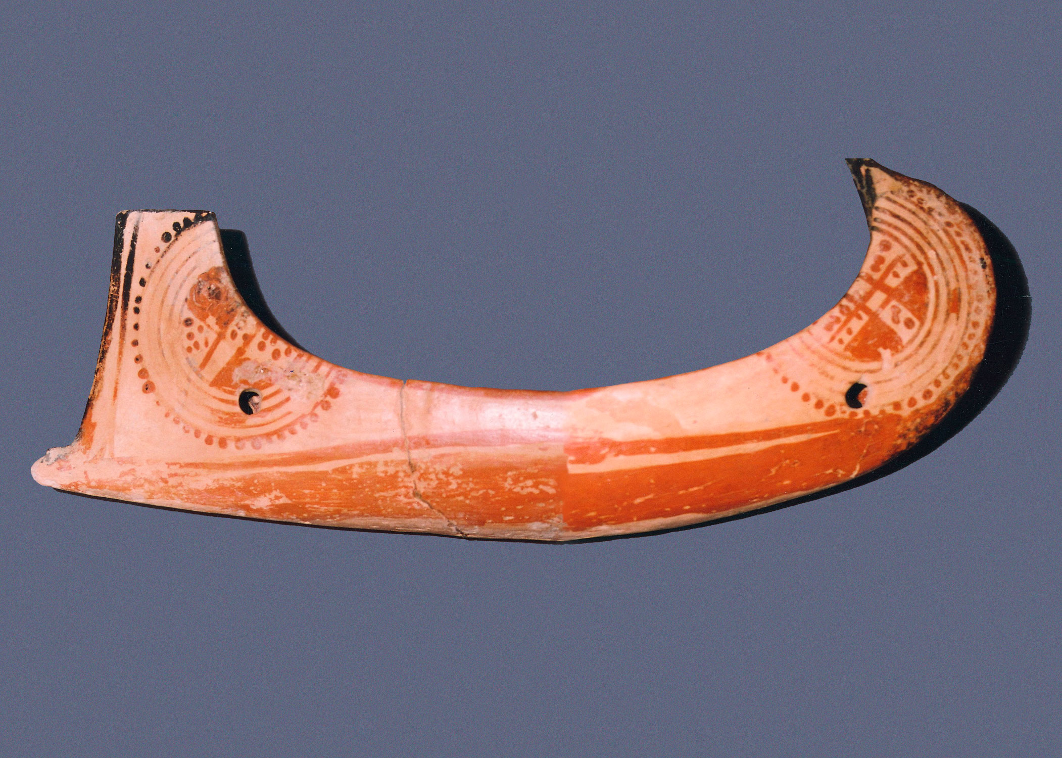 1. Πήλινο ομοίωμα πλοίου (σημ. 26) (Αρ. Ευρ. 1959) από παιδικό τάφο στη θέση Μαγαζιά. Η γραπτή διακόσμησή του αποδίδει και το σανίδωμα του σκαριού και αποτελεί σπάνιο εύρημα. Η διακόσμηση που καλύπτει και τις δύο πλευρές του παραπέμπει σε παρόμοια διακόσμηση, με κάποιες διαφοροποιήσεις όμως, πήλινου κρατήρα από την Ξερόπολη του Λευκαντίου, ο οποίος χρονολογείται στην Υποπρωτογεωμετρική περίοδο (σημ. 27) (εικ. 3).