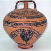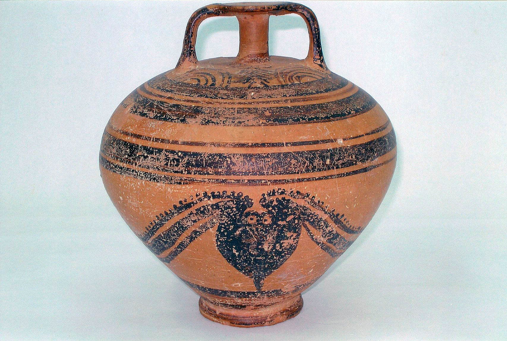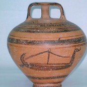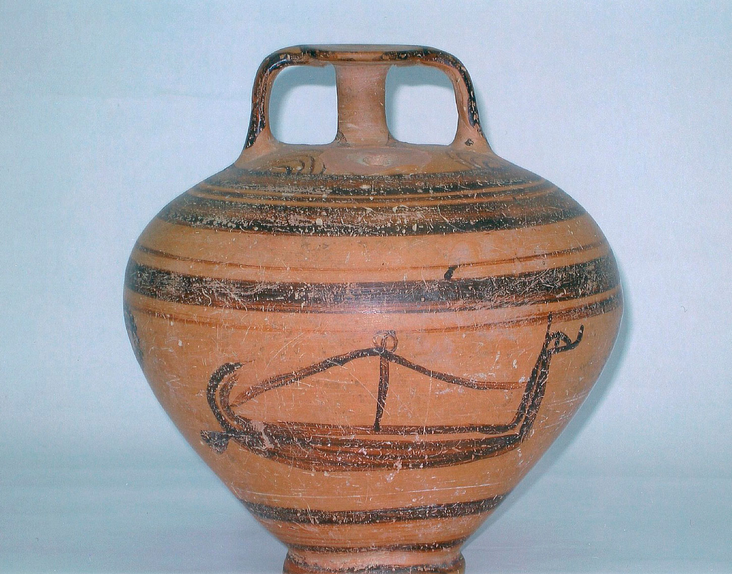 2. Πήλινος ψευδόστομος αμφορέας (Αρ. Ευρ. 77) με γραπτή παράσταση πλοίου στη μία πλευρά του και χταπόδι στην άλλη (εικ. 4-5).