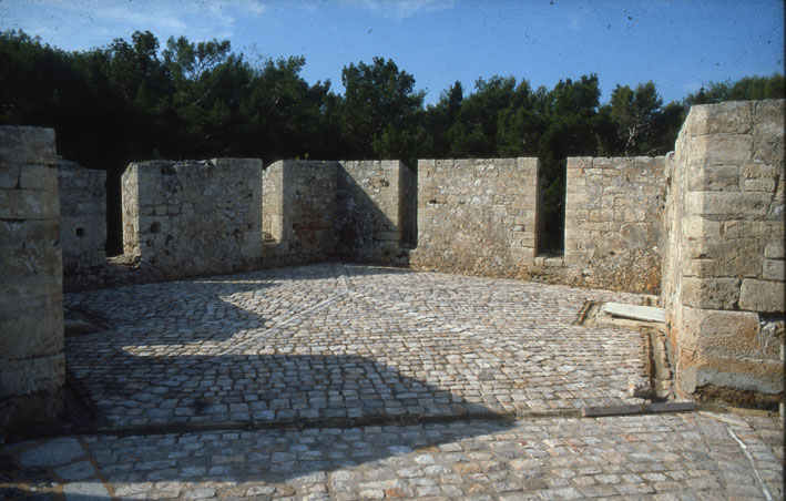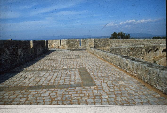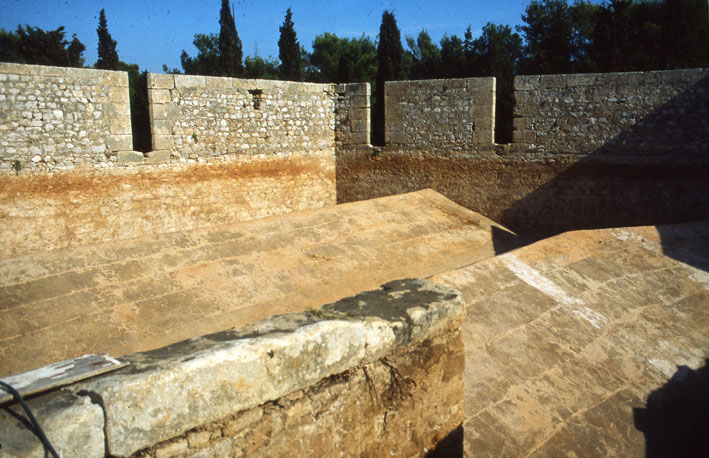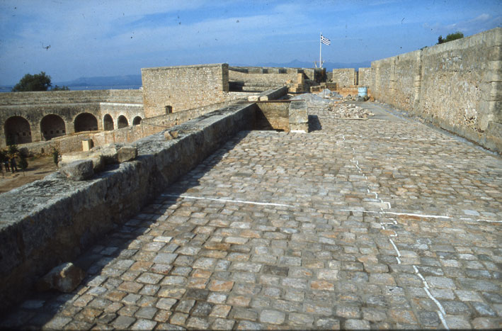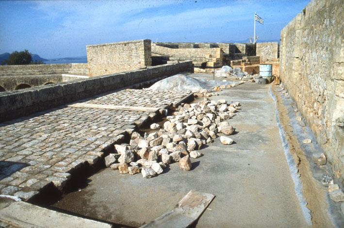 Μέγιστο πρόβλημα ήταν η στεγάνωση των χώρων της ακρόπολης, διότι τα έργα της συντήρησης που είχαν γίνει, στο διάστημα που το φρούριο λειτούργησε ως φυλακή, ήταν η κάλυψη των επιφανειών των περιπολίων και των πέντε προμαχώνων με τσιμέντο και πίσσα, μέθοδος που δεν εξασφάλιζε την απαιτούμενη στεγανότητα στους υποκείμενους χώρους. Προχωρήσαμε λοιπόν στην αφαίρεση των αλλεπάλληλων στρώσεων τσιμέντου και πίσσας, με στόχο την αποκάλυψη της αρχικής μορφής των λιθόστρωτων επιφανειών, πράγμα που είχε ως αποτέλεσμα να διαπιστωθούν εκτεταμένα κενά στην αρχική επίστρωση (εικ. 12). Η κάλυψη των κενών αυτών στις επιφάνειες των περιπολίων (εικ. 13α-β, 14α-γ) πραγματοποιήθηκε με τοποθέτηση νέων κυβολίθων σχηματισμένων από τους αργούς λίθους των κατεδαφισθέντων μαντρότοιχων των ακτίνων. Το ίδιο έγινε και στη ρομβοειδή κεκλιμένη προς τα πλευρικά αυλάκια απορροής επιφάνεια και των πέντε προμαχώνων (εικ. 15α-β), όπου επισημάνθηκαν σοβαρές φθορές από την εγκατάλειψη και τις ρίζες της αυτοφυούς βλάστησης. Με τις εργασίες αποκαταστάθηκε η ομοιογένεια της εικόνας των λιθόστρωτων στα περιπόλια.