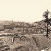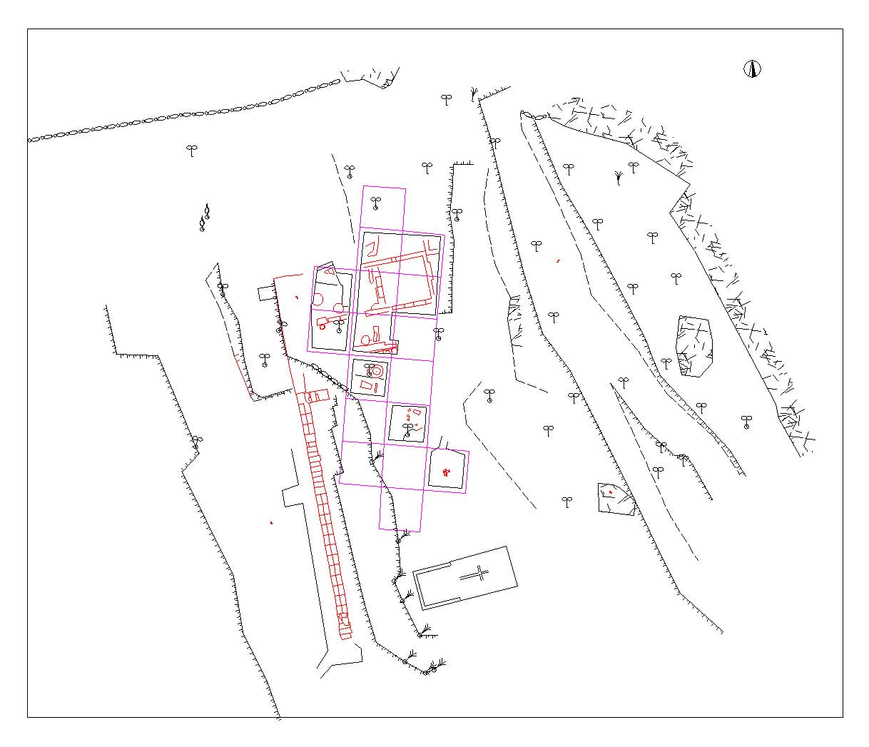 Στο επάνω πλατύ άνδηρο, που καταλαμβάνει έκταση 600 τ.μ. περίπου, η ανασκαφή έφερε στο φως τρία οικοδομήματα, στον κατά μήκος άξονα Β-Ν (εικ. 9).