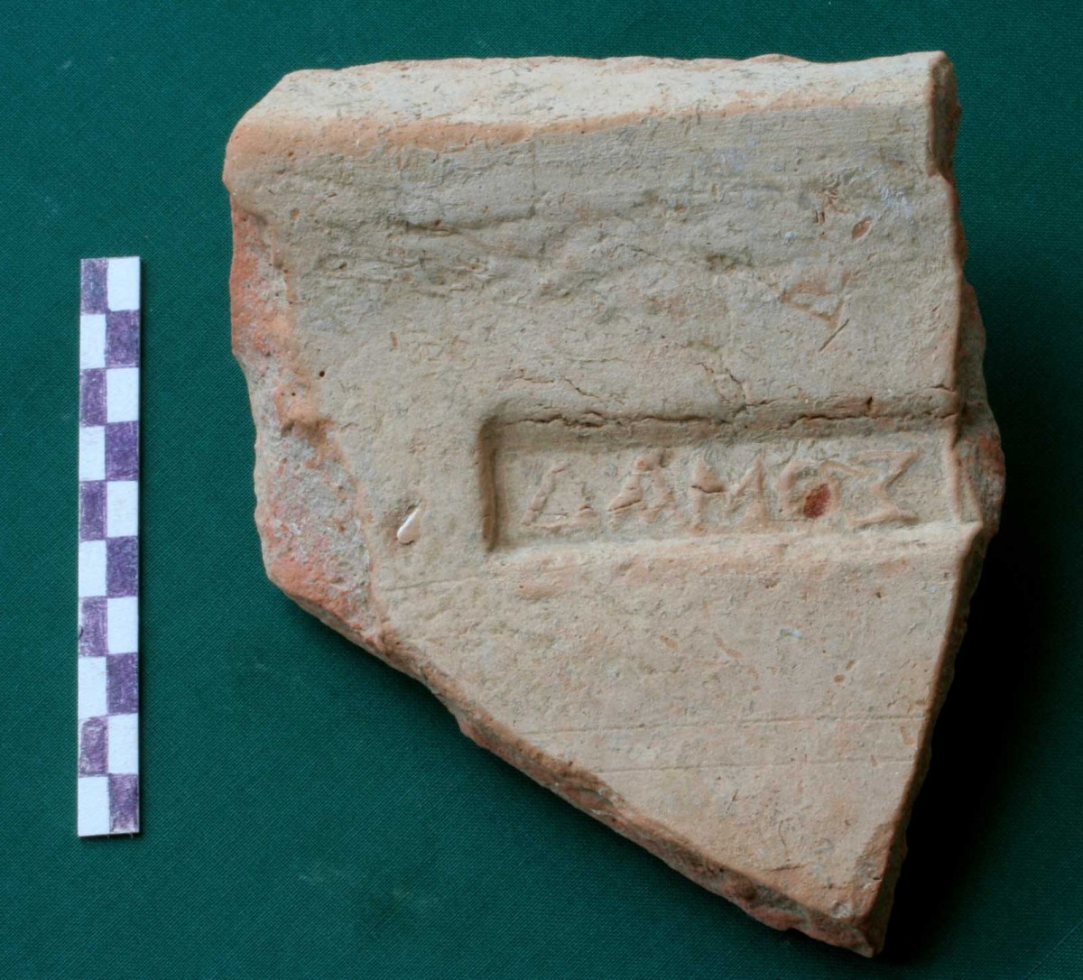 Μέσα στο στρώμα καταστροφής, βρέθηκαν δύο τμήματα στρωτήρων με τη σφραγίδα ΔΑΜΟΣΙΟΙ, που δηλώνει αναμφίβολα τον δημόσιο χαρακτήρα των κτιρίων (εικ. 13).