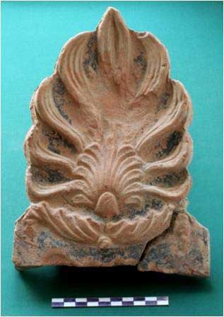 Από τη λακωνικού τύπου κεράμωση του κτιρίου βρέθηκε μεγάλος αριθμός ανθεμωτών ακροκεράμων διαφόρων τύπων (εικ. 14).