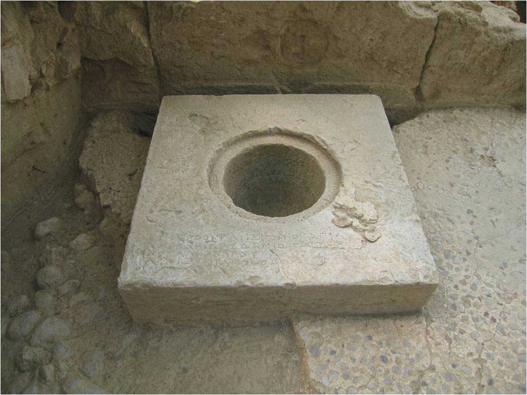 Στο επάνω μέρος ο «θησαυρός» θα πρέπει να έφερε πώμα, με σχισμή για τη ρίψη των νομισμάτων. Το πώμα, προφανώς μεταλλικό, ασφαλιζόταν με διπλή κλειδαριά, τα κλειδιά της οποίας κατείχαν έμπιστα πρόσωπα και συνήθως οι ιερείς του ναού.