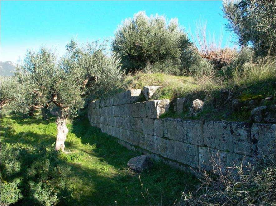 Στο βόρειο άκρο του υψώματος, όπου τοποθετείται η αρχαία ακρόπολη, υπάρχει ορατό τμήμα του αρχαίου τείχους με ορθογώνιους πύργους, του 4ου αι. π.Χ., κτισμένο με επιμέλεια κατά το ισοδομικό σύστημα (εικ. 2). Ιδιαίτερο ενδιαφέρον παρουσιάζουν τα τεκτονικά σημεία που διακρίνονται ευκρινώς χαραγμένα στην επιφάνεια των δόμων του τείχους. Στη νότια πλευρά της ράχης, υπάρχουν τμήματα τοίχων ή μεμονωμένων λιθοπλίνθων εντοιχισμένων σε δεύτερη χρήση στις σύγχρονες ξερολιθιές, καθώς και διάσπαρτα τμήματα ραβδωτών κιόνων.