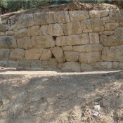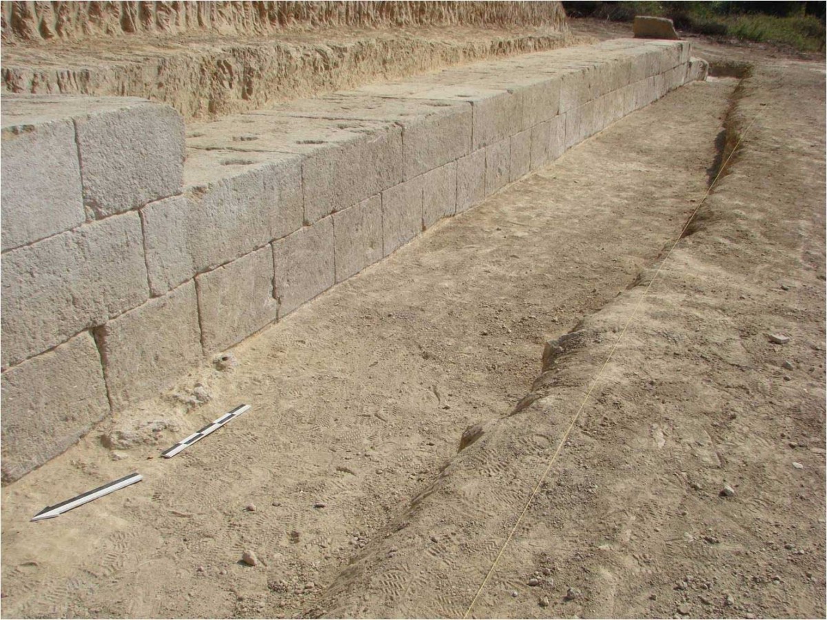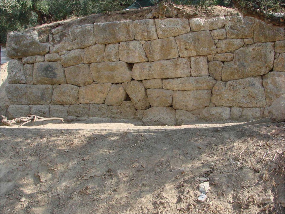 Σε επαφή προς το νότιο άκρο του τοίχου 1 ήλθε στο φως άλλος ένας αναλημματικός τοίχος 2, της ίδιας κατεύθυνσης, ο οποίος κατασκευάστηκε μεταγενέστερα ως κατά μήκος επέκταση του παλιότερου τοίχου 1 (εικ. 8). Ο αναλημματικός τοίχος 2 είναι κατασκευασμένος με μεγάλη επιμέλεια, ισοδομικά, από ορθογώνιους λιθόπλινθους. Το μήκος του είναι 30 μ. και σώζεται σε μέγιστο ύψος τριών δόμων, δηλαδή 1,20 μ. Μεταξύ των δύο αναλημματικών τοίχων αποκαλύφθηκαν τα λείψανα βαθμιδωτής κατασκευής, η οποία προφανώς αποτελεί τμήμα της ανωδομής του αναλημματικού τοίχου 2.