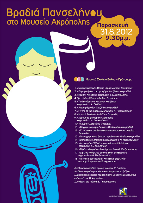Το Μουσείο της Ακρόπολης γιορτάζει την Αυγουστιάτικη Πανσέληνο την Παρασκευή 31 Αυγούστου 2012, με ρομαντικές μελωδίες για το φεγγάρι από το Μουσικό Σχολείο Βόλου, στον προαύλιο χώρο του στις 9.30 μ.μ.