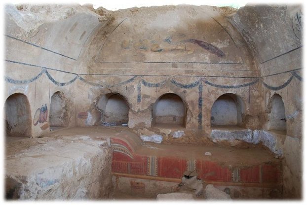 Ο τάφος, που χρονολογήθηκε στον 3ο μ. Χ. αιώνα και έχει διαστάσεις 2,40 Χ 2,30 μ. είναι θαλαμοειδής και υπόγειος ενώ η σκεπή του σχημάτιζε καμάρα, η οποία όμως έχει καταρρεύσει – για τον λόγο αυτό έχει τοποθετηθεί ένα πρόχειρο στέγαστρο. Στο εσωτερικό του, υπήρχαν δύο λάρνακες εκ των οποίων η μία περιείχε γυναικεία ταφή, όπως αποδεικνύει το καταπληκτικό πορτρέτο μιας όμορφης νέας γυναίκας, που απεικονίζεται ξαπλωμένη σε κρεβάτι (τη λάρνακα).