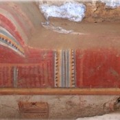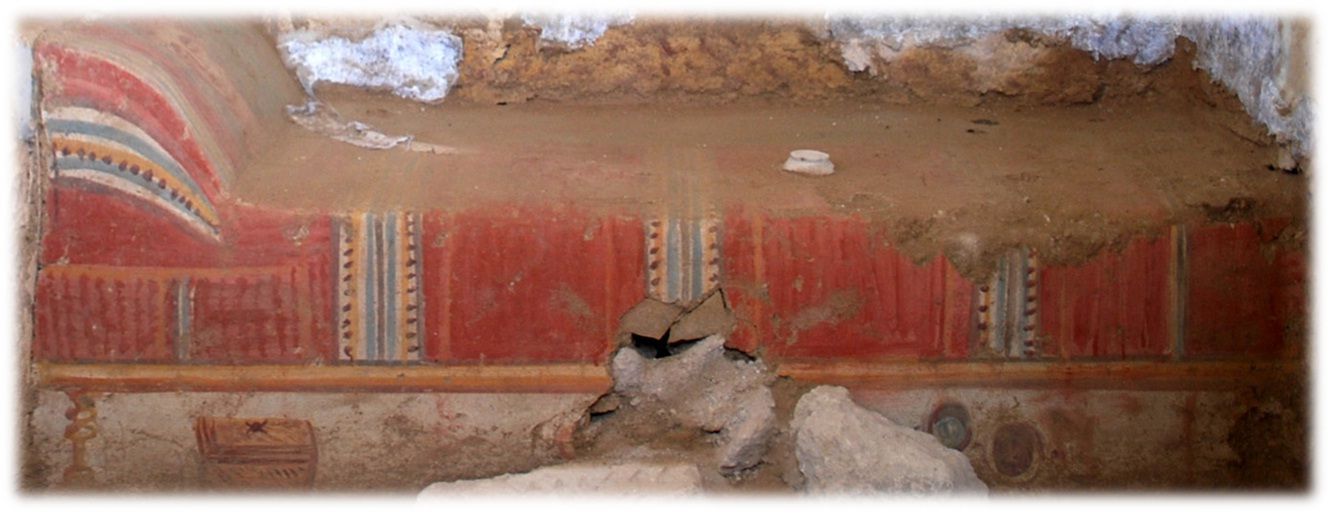 Να σημειωθεί ότι η λάρνακα δεν έχει ανοιχτεί, όπως ανέφερε όμως ο κ. Μίνως σε μία πρώτη έρευνα, που έγινε με χρήση κάμερας υπερύθρων, η οποία εισχώρησε από μια ρωγμή εντοπίστηκαν θραύσματα αγγείου και χώμα. Η δεύτερη λάρνακα πάντως, που έχει χτιστεί κατά μήκος του ανατολικού τοίχου, δεν είναι τόσο καλοδιατηρημένη. Φέρει ωστόσο διάκοσμο από πράσινη γιρλάντα και μωβ λουλούδι.
