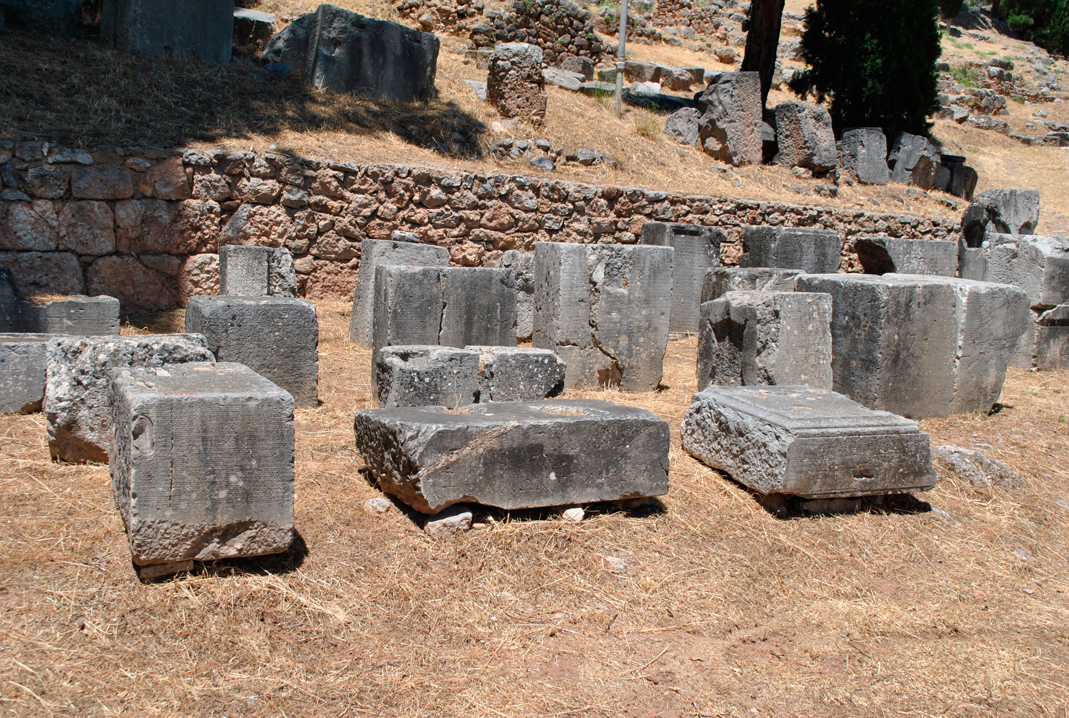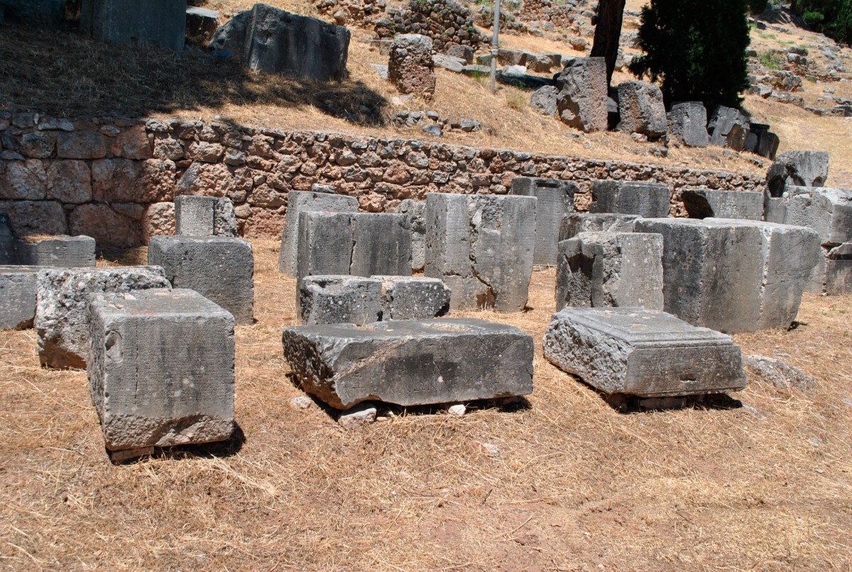 Οι αναθηματικές επιγραφές συνήθως συνόδευαν κάποιο ανάγλυφο ή ολόγλυφο πλαστικό έργο ή οικοδόμημα, το οποίο αφιερωνόταν στον θεό. Οι αναθέτες ήταν πόλεις, ηγεμόνες ή ευκατάστατα πρόσωπα και προέρχονταν από όλα τα μήκη και πλάτη του ελληνόφωνου κόσμου ή και εκτός αυτού. Ένδειξη της εμβέλειας του ιερού στις παρυφές του ελληνισμού είναι το ανάθημα των Τυρρηνών κατά τα τέλη του 6ου αι. ή το πρώτο τρίτο του 5ου αι. π.Χ. Φαίνεται ότι πάνω στη σωζόμενη βάση είχε εγερθεί ένας ορειχάλκινος κίονας που υποστήριζε λέβητα. Στο κάτω μέρος του αφιερώματος υπάρχουν δύο κατάλογοι με ονόματα νικητών των αγώνων των Σωτηρίων που χρονολογούνται περί το 225 π.Χ., ενώ στη δεξιά πλευρά και στην οπίσθια όψη, δύο ακόμη κατάλογοι με ονόματα νικητών (Μ.Δ. 1560 + 4074, εικ. 15). Λίγο νεότερο είναι το ανάθημα της πόλης της Σάμου, το οποίο ανάγεται στις αρχές του 5ου αι. π.Χ. Η βάση θα έφερε ένα χάλκινο άγαλμα φυσικού μεγέθους, όπως προκύπτει από τις εμφανείς κοιλότητες στην άνω επιφάνεια (Μ.Δ. 1790), ενώ στο δεύτερο τέταρτο του ίδιου αιώνα στήθηκε ο έφιππος ανδριάντας, ένα ανάθημα των Θεσσαλών (Μ.Δ. 7575).