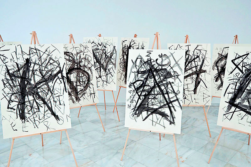 Στον αύλειο χώρο του μουσείου θα τοποθετηθεί η σιδερένια εγκατάσταση «Επτά Πύλες». Μέσα στο μουσείο (προθάλαμοι και επιγραφική στοά) θα παρουσιαστούν η εγκατάσταση «Μάθημα γραφής», το έργο από ακρυλικό σε χαρτί «Χρησμοί- τετράπτυχο», το έργο «Πάπυρος» (μελάνι σε χαρτί), η εγκατάσταση «Ο ίσκιος του ανθρώπου είναι ο πολιτισμός του», η εγκατάσταση από πλεξιγκλάς «Κιβωτός πληροφορίας», καθώς και μερικά από τα «Ανθρώπινα περιγράμματα» του Γιώργου Ξένου.