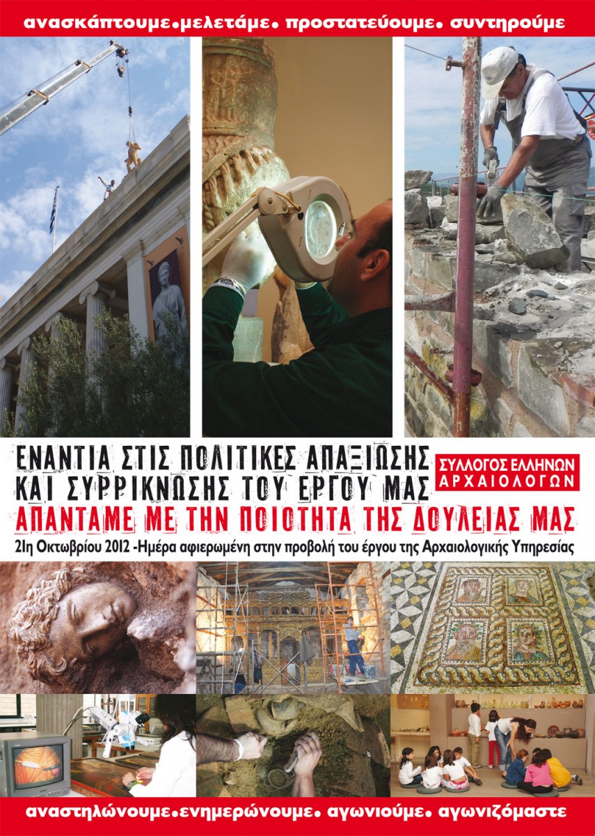 Σειρά δράσεων διοργανώνει ο Σύλλογος Ελλήνων Αρχαιολόγων με στόχο την προβολή του πολυσχιδούς έργου της Αρχαιολογικής Υπηρεσίας. Έτσι την Κυριακή 21 Οκτωβρίου 2012 οι Έλληνες αρχαιολόγοι ανοίγουν τις πόρτες των μουσείων, των μνημείων, των αρχαιολογικών χώρων, των αποθηκών ή των εργαστηρίων συντήρησης και περιμένουν όσους ενδιαφέρονται να ενημερωθούν για τον τρόπο με τον οποίο δουλεύουν, αλλά και για τη σημασία της δουλειάς τους για την εκπαίδευση, την οικονομία και την ανάπτυξη.