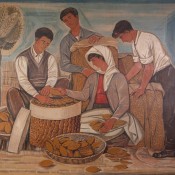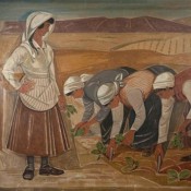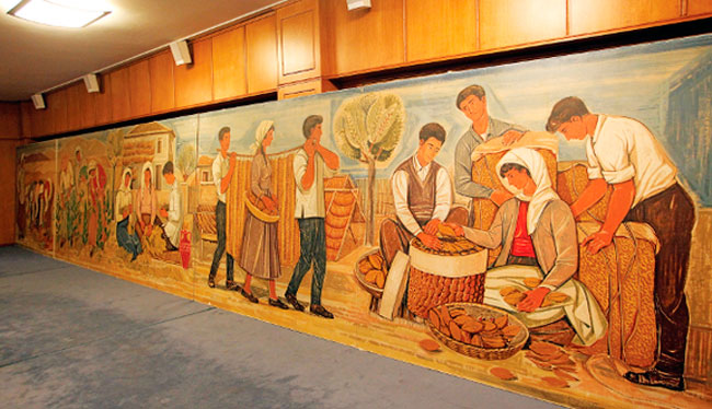 Φιλοτεχνημένο το 1960 για να κοσμήσει εγκαταστάσεις του Εθνικού Οργανισμού Καπνού Δυτικής Θεσσαλονίκης, το μνημειακών διαστάσεων διακοσμητικό σύνολο, που φέρει την υπογραφή του χαράκτη και ζωγράφου Τάσσου Αλεβίζου (1914-1985) και της συντρόφου του Λουκίας Μαγγιώρου (1914-2008), παρέμενε για χρόνια στην κλειστή καπναποθήκη, ευτυχώς ανέπαφο. Το έργο αποτελείται από πέντε επιμέρους συνθέσεις ύψους 2 μ. κι έχει συνολικό μήκος 12,40 μ. (μικτή τεχνική σε ύφασμα επικολλημένο σε ξύλο).