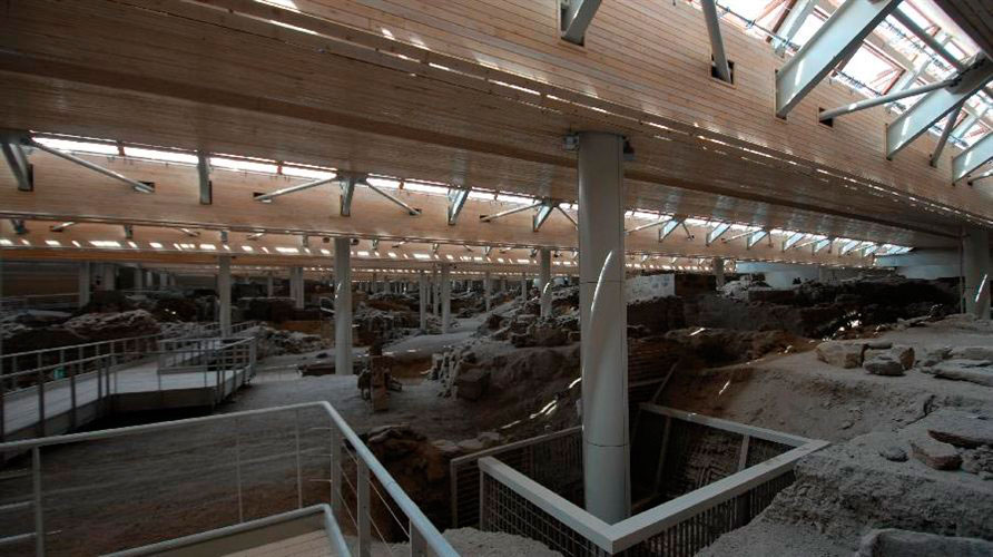 Εξαιρετική εμπειρία όμως, την οποία –αν και περασμένος Οκτώβρης– απολαμβάνουν πολλοί τουρίστες είναι η επίσκεψη στο στέγαστρο, που καλύπτει περί τα 14 στρέμματα ανασκαμμένου αρχαιολογικού χώρου. Πρόκειται φυσικά για μία υπερκατασκευή, ο σχεδιασμός της οποίας έγινε από τον αρχιτέκτονα κ. Νίκο Φιντικάκη, απόντα, αν και δικαιολογημένα από τη συγκεκριμένη ξενάγηση, για τον οποίο ο κ. Ντούμας είχε να πει ιδιαίτερα καλά λόγια για τη σύλληψη της ιδέας, τον σεβασμό στα μνημεία και την αποτελεσματικότητα στην εξεύρεση λύσεων.