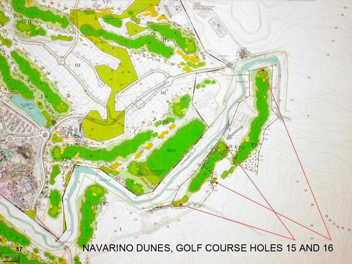 Η ύπαρξη πληθώρας οικιστικών καταλοίπων της ΠΕ ΙΙ περιόδου στην ευρύτερη περιοχή του γηπέδου γκολφ είχε ως συνέπεια την αλλαγή των αρχικών σχεδιασμών για την ανέγερση διαφόρων ογκωδών κτιριακών συγκροτημάτων, ενώ κάποιες διαδρομές χρειάστηκε να μετατοπιστούν.