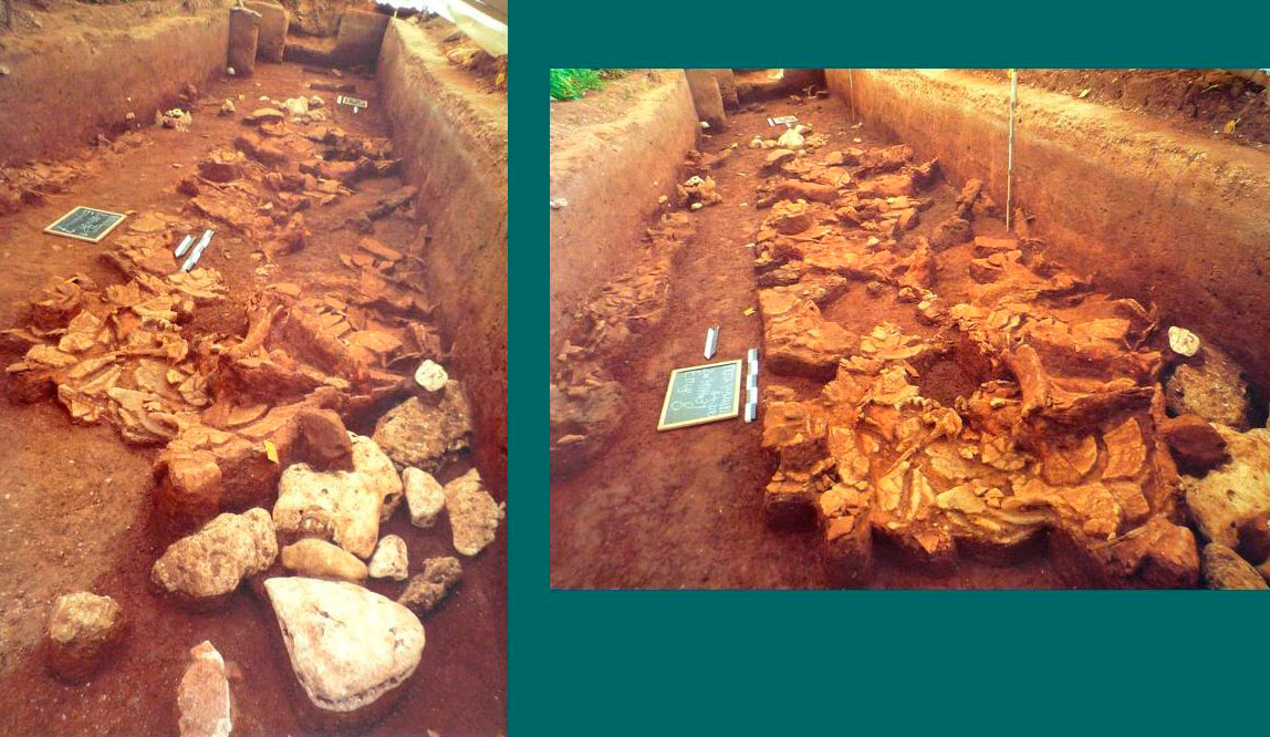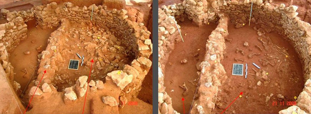 Πολύ ενδιαφέρον παρουσιάζει και το σκελετικό υλικό, που βρέθηκε μέσα στον τάφο (εικ. 13). Ήδη κατά τη διάρκεια των ανασκαφών είχαμε διαπιστώσει την ύπαρξη δύο κρανίων αλόγου ανάμεσα στα οστά ζώων. Το ένα κρανίο μάλιστα βρέθηκε τοποθετημένο πάνω στην κοιλιακή χώρα του ενός των νεκρών. Οι καθηγήτριες ανθρωπολογίας Lynne Schepartz του Πανεπιστημίου της Φλόριντα και Sari Miller-Antonio του Πανεπιστημίου της Καλιφόρνια, οι οποίες μελετούν ήδη το ανθρωπολογικό υλικό, αναγνώρισαν ανάμεσα στα οστά ζώων και τμήματα οστών από πρόβατο, κατσίκι και ίσως και ελάφι. Φαίνεται πως υπήρξαν προσφορές προς τιμήν των νεκρών ή τοποθετήθηκαν κτερίσματα σε μορφή τροφής.