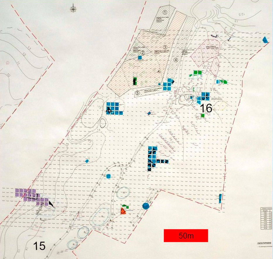 Ο δρόμος που προαναφέρθηκε επεκτείνεται προφανώς ανατολικά έως τη νοτιοανατολική γωνία της περιφραγμένης έκτασης της Π.Ο.Τ.Α, όπου εντοπίστηκαν τουλάχιστον δύο κτίρια της ΠΕ ΙΙ εποχής (εικ. 2). Σε ένα χώρο αυτών των κτιρίων, ο οποίος ερευνήθηκε ανασκαφικά, βρέθηκαν συγκεντρωμένα πολλά, πεσμένα, μεγάλα πιθάρια (εικ. 8), αλλά και μερικά μικρά αγγεία, μεταξύ των οποίων ιδιαίτερα αξιοσημείωτο είναι ένα μεγάλο τμήμα από τηγανόσχημο αγγείο του Mainland Type! Προφανώς ο χώρος αυτός ήταν αποθήκη, ίσως για ελαιόλαδο ή κρασί. Τα δύο κτίρια, τα οποία δεν έχουν ερευνηθεί ανασκαφικά, προφανώς συνεχίζονται ανατολικά στο διπλανό κτήμα.