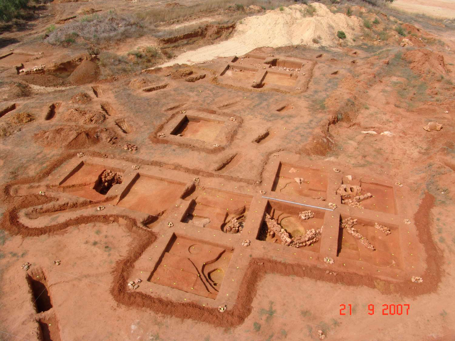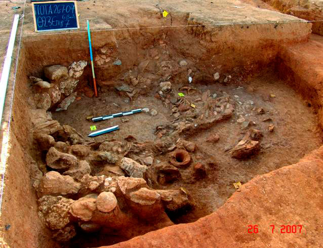 Νοτιότερα, αποκαλύφθηκε ένα πυκνά οικοδομημένο τμήμα του πρωτοελλαδικού οικισμού, που καταλαμβάνει 14 ανασκαφικά τετράγωνα 5×5 μ. (εικ. 7).