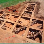 Στις δύο πλευρές ενός αρχαίου δρόμου, που είχε κατεύθυνση από δυτικά-βορειοδυτικά προς ανατολικά-νοτιοανατολικά, αναπτύσσεται μια σειρά ορθογώνιων κατοικιών με αυλές. Οι τοίχοι αυτών των οικιών είχαν γερά θεμέλια κατασκευασμένα από αργούς λίθους, το ύψος των οποίων έφθανε το 1 μ., ενώ η ανωδομή τους ήταν από πλίθρες.