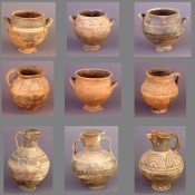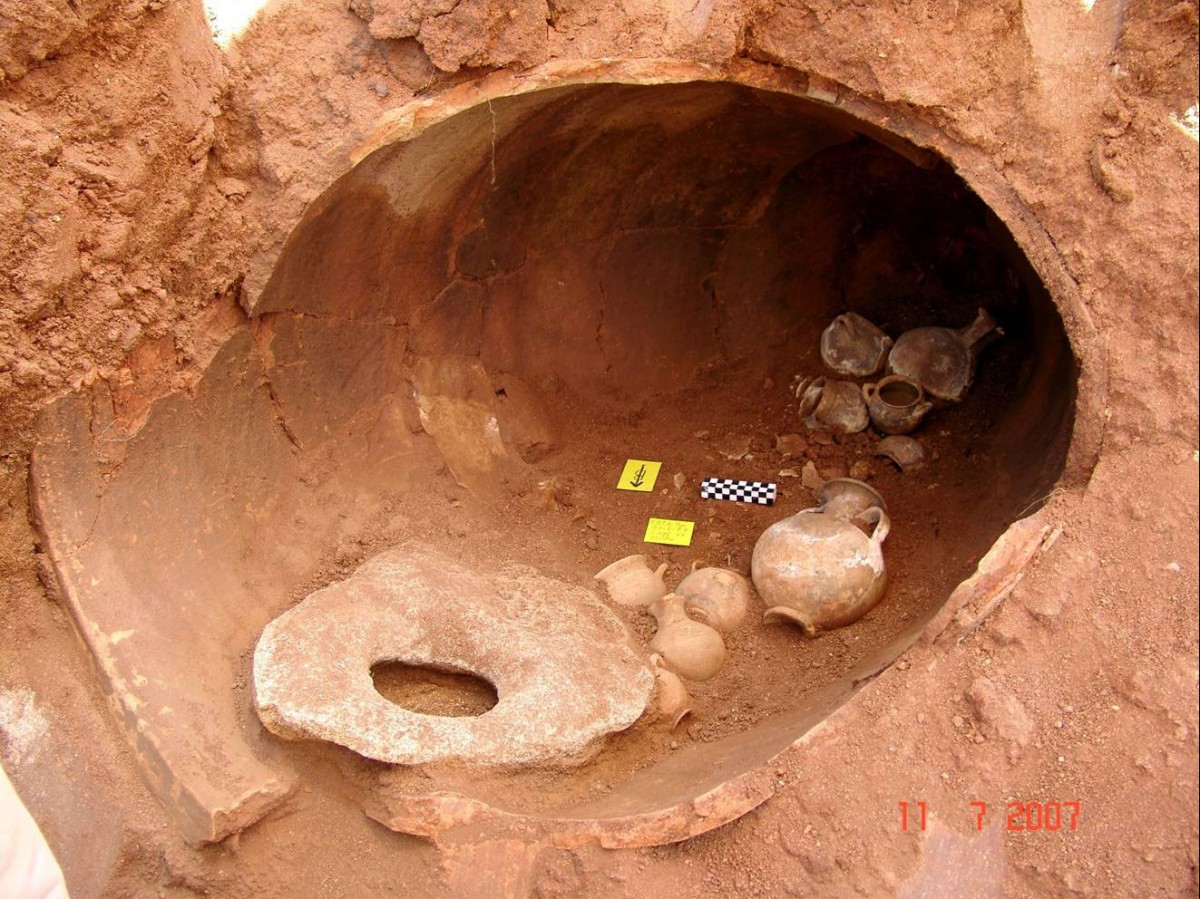 Στη διαδρομή 13 του γηπέδου γκολφ, πολύ κοντά στη νότια περίφραξη της εγκατάστασης της Π.Ο.Τ.Α. Ρωμανού, ανακαλύφθηκε το έτος 2007 μια απομονωμένη ταφή σε πίθο της Πρωτογεωμετρικής Εποχής (1060 έως 900 π.Χ.) (εικ. 1). Ο πίθος ήταν οριζοντίως τοποθετημένος και είχε μήκος 1,50 μ. και μέγιστη διάμετρο σώματος 0,85 μ. Το στόμιό του ήταν σφραγισμένο με μια λίθινη άγκυρα, που χρησιμοποιήθηκε για αυτόν το σκοπό σε δεύτερη χρήση. Στο εσωτερικό περιείχε τα σκελετικά λείψανα ενός νεκρού, που τον συνόδευαν πλούσια κτερίσματα σε καλή κατάσταση διατήρησης: δέκα πήλινα αγγεία με γραπτή διακόσμηση, τα περισσότερα ακέραια, ένα χάλκινο δακτυλίδι και δύο σιδερένιες περόνες (εικ. 2).