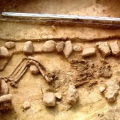 Στο όριο των τετραγώνων Β15 με Β16 κατά την αφαίρεση μιας ελιάς ήλθε στο φως ένας σωρός από λίθους με πολλά όστρακα της Γεωμετρικής Εποχής. Κάτω από τον λιθοσωρό, αποκαλύφθηκε ένας κιβωτιόσχημος τάφος της Γεωμετρικής Εποχής με προσανατολισμό από Α-Δ. Ο νεκρός, τοποθετημένος σε συνεσταλμένη στάση, είχε το κεφάλι του στη Δύση. Σε ένα δάχτυλο του χεριού φορούσε ένα χάλκινο δαχτυλίδι και δίπλα στο κεφάλι του βρέθηκαν δύο μικρά, κλειστά αγγεία (εικ. 3).