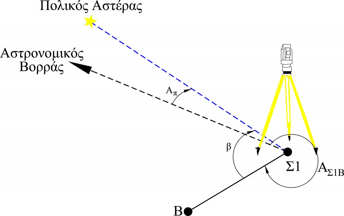 Ο προσδιορισμός του αστρονομικού αζιμουθίου ΑΣ1Β πραγματοποιείται με παρατηρήσεις στον Πολικό Αστέρα (α Ursa Minoris), χρησιμοποιώντας έναν ολοκληρωμένο γεωδαιτικό σταθμό και εφαρμόζοντας τη μέθοδο της ωριαίας γωνίας (σημ. 3).