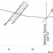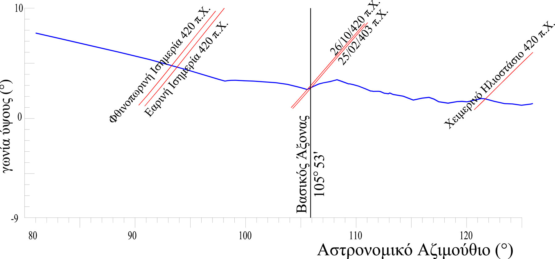 Οι τρεις παραπάνω γραμμές απεικονίζονται σε ένα κοινό διάγραμμα, αστρονομικού αζιμουθίου-γωνίας ύψους (εικ. 5).
