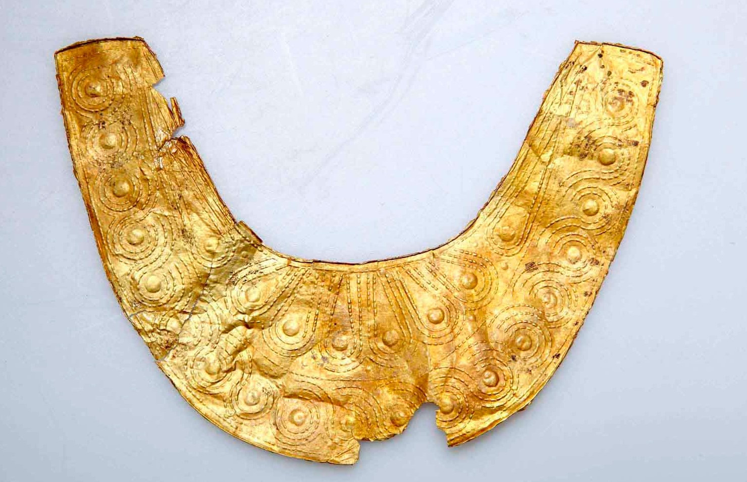 Το πρώτο είναι ένα έλασμα μηνοειδούς σχήματος κατασκευασμένο από έλασμα χρυσού, που χρονολογείται στο 950 π.Χ. περίπου (εικ. 1). Προέρχεται από τη γυναικεία ταφή που εντοπίστηκε στο εσωτερικό κτηρίου στη θέση Τούμπα του Λευκαντιού.