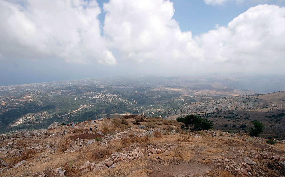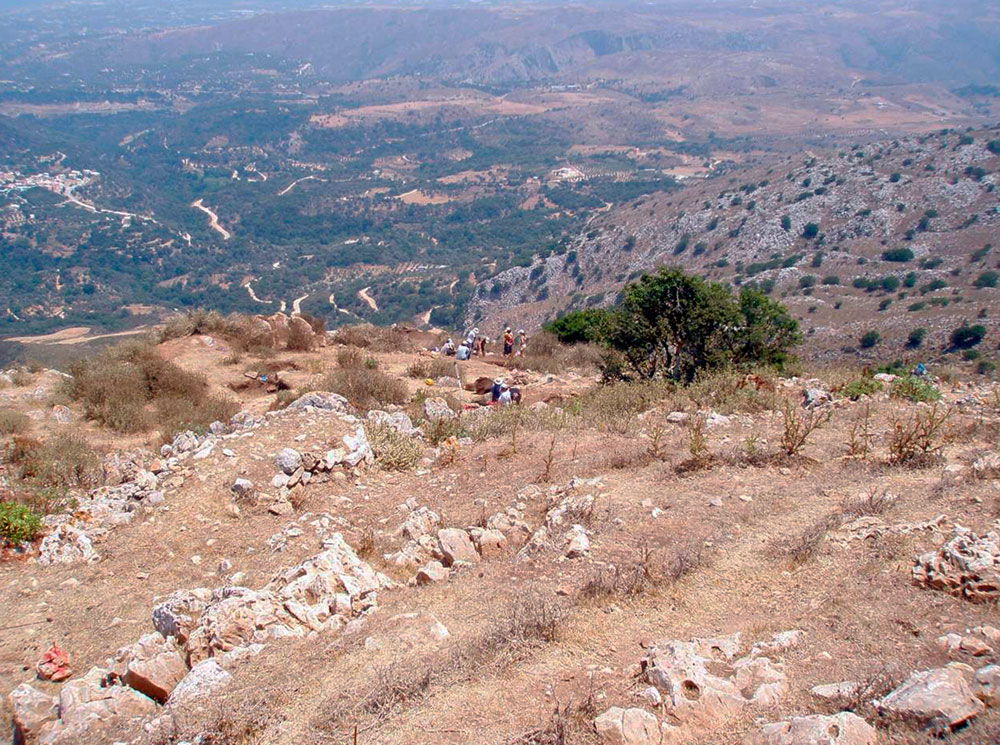 Από την κορυφή αντιλαμβάνεται κανείς και κάτι άλλο: ότι η εικόνα της απομονωμένης, υψηλής και σχεδόν απρόσιτης κορυφής που έχει από κάτω είναι κάτι εντελώς σχετικό. Η κορυφή είναι εύκολης πρόσβασης και βρίσκεται μέσα σε περιοχή «εξημερωμένη». Γύρω και κυρίως προς νότον απλώνονται οροπέδια, παντού μικρά λακιά ελάχιστης έκτασης, δολίνες προσχωσιγενείς, διαμορφωμένες από τα νερά των ασβεστολιθικών όγκων και την επί αιώνες ανθρώπινη εργασία. Οργωμένα, καταπράσινα, με μεγάλες και μικρές πέτρες για τη συγκράτηση της υγρασίας, σε συνδυασμό με τις κατάφυτες πεζούλες κάνουν το τοπίο φιλικό, ανθρώπινο, καθόλου απρόσιτο και απότομο. Τώρα η περιοχή είναι βοσκοτόπια αλλά ως πριν μερικές δεκαετίες καλλιεργούσαν λαχανικά μη ποτιστικά, που μεγάλωναν με τη νυχτερινή υγρασία και την υγρασία του εδάφους. Ήταν το αόρι των διαφόρων χωριών, διαμορφωμένο σε καλλιεργήσιμες μικρές εκτάσεις σαν κήπος. Οι κάτοικοι ονομάζουν το οροπέδιο γύρω από την κορυφή του Αγίου Πνεύματος «κάμπο». Επομένως η κορυφή του λόφου, όπου βρίσκεται το Ιερό Κορυφής, κάθε άλλο παρά απομονωμένη είναι. Είναι σε απόσταση απολύτως προσιτή από την παραγωγική και την κατοικημένη περιοχή. Άλλωστε περιμετρικά του λόφου εντοπίστηκαν με την επιφανειακή έρευνα, κυρίως στα βορειοανατολικά, αλλά και στα νότια και δυτικά, οι οικισμοί της ΥΕΙΙΙΓ περιόδου, οι λεγόμενοι «οικισμοί καταφύγια», αν και στην περίπτωσή μας η θέση τους και η γεωμορφολογία του περιβάλλοντος υποδεικνύουν μάλλον μια επιλογή προς την οικονομική εκμετάλλευση του υψηλού χώρου.