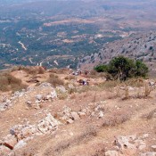 Όταν αντίστροφα κινηθεί κανείς προς την κορυφή ακολουθώντας τον σύγχρονο δρόμο, ή ένα από τα παλιά μονοπάτια που συγκλίνουν προς τα εκεί και τα οποία ακολουθούν τα σημερινά κοπάδια από γιδοπρόβατα, αποκτά μια άλλη εικόνα. Αλλιώς φαίνονται τα πράγματα από την κορυφή. Η αμφίδρομη θέα προς όλη την περιοχή εκδιπλώνεται σε όλο της το μεγαλείο συμπεριλαμβάνοντας και την κοιλάδα του Αγίου Βασιλείου (εικ. 2, 3). Από την κορυφή έχει κανείς μια συνολική θέα του περίγυρου, μία συγκεντρωτική «γεωγραφική» εικόνα. Μπορεί να παρατηρήσει και να εκτιμήσει καλύτερα τα ανθρωπογενή ιστορικά τοπία και τους ποικίλους τρόπους διαμόρφωσής τους από τους κατάφυτους λόφους με ελιές και κυπαρίσσια, τους υψηλότερους λειμώνες, τις πεζούλες, τα «βιοτεχνικά» δάση βελανιδιάς και τις προστατευμένες κοιλάδες με τις πηγές. Γι’ αυτό ήταν πάντα θέση βίγλας, όσο μπορούμε να γνωρίζουμε, από τον Ύστερο Μεσαίωνα και μετά, έως σήμερα που είναι σημείο παρατήρησης πιθανών εστιών πυρκαγιών από την Πυροσβεστική.