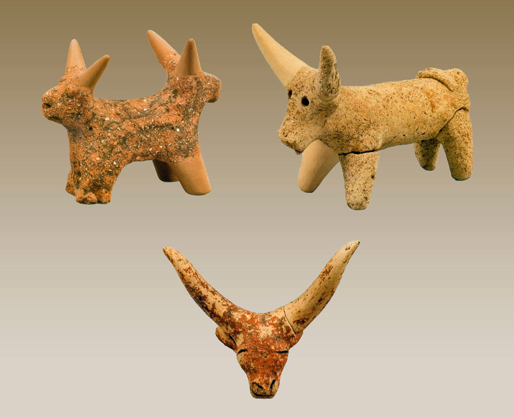 Τα ζωόμορφα ειδώλια είναι σχεδόν όλα βοοειδή. Πολλά από αυτά είναι συμπαγή, αλλά στα περισσότερα το σώμα είναι κοίλο με εσωτερική ή εξωτερική αύλακα. Το κεφάλι είναι πάντα συμπαγές και ορισμένων ελαχίστων το κεφάλι έγινε σε μήτρα και προσαρμόστηκε κατόπιν σε κοίλο σώμα. Σε αυτές τις περιπτώσεις πρόκειται για μεγαλύτερα ειδώλια (εικ. 7).