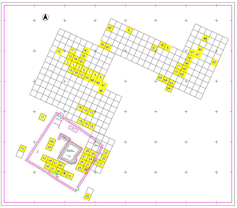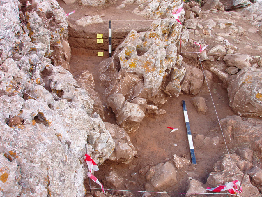 Στην εικόνα 2 φαίνεται ο κάνναβος που χαράχτηκε για την ανασκαφή και με κίτρινο σημειώνονται οι τομές που ανασκάφηκαν. Οι επιχώσεις ήταν ελάχιστες, ανάμεσα στους φυσικούς βράχους. Συνήθως δεν ξεπερνούσαν το μισό μέτρο. Αρχαιολογικά ευρήματα υπήρχαν τόσο στις επιχώσεις, όσο και ανάμεσα στις σχισμές των βράχων, χωρίς να υπάρχουν στοιχεία που να δείχνουν ότι αποτελούν αποθέσεις. Ένα από τα σημαντικά κεκτημένα της ανασκαφής είναι ότι διασαφηνίστηκε η στρωματογραφία. Στο μεσαίο άνδηρο, όπου επικεντρώθηκαν οι αρχικές προσπάθειες, οι τομές περιλάμβαναν στην ουσία δύο στρώματα. Το πρώτο, το επιφανειακό και διαταραγμένο, είχε πάχος 10-15 εκ. με σύγχρονες αποθέσεις, ευρήματα μινωικά αλλά και διαφόρων άλλων περιόδων και πολλά οργανικά κατάλοιπα. Το δεύτερο στρώμα, που σε μερικές τομές έσωζε κατά τόπους αδιατάρακτες μικροπεριοχές καθαρά μεσομινωικές, και το τρίτο, το κοκκινωπό φυσικό (terra rossa), όπου τα ευρήματα σταματούσαν. Από το μεσαίο στρώμα προέρχεται ο κύριος όγκος των ευρημάτων, αγγεία και ειδώλια. Οι αδιατάρακτες περιοχές δείχνουν ότι πρόκειται για αρχαίες επιχώσεις, δευτερογενείς. Στις εικόνες 3 και 4 φαίνεται η στρωματογραφία και η όψη της τομής.