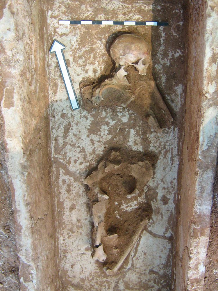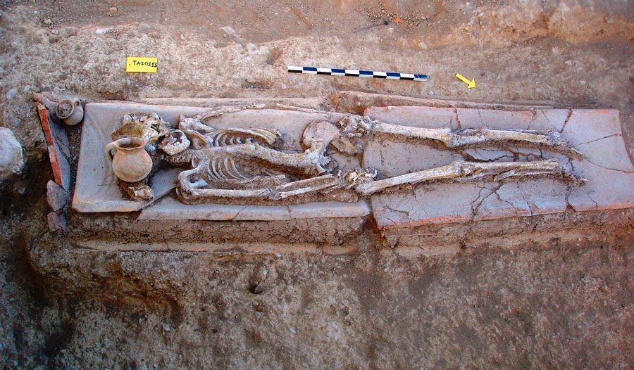 Γύρω από τις δύο σαρκοφάγους βρέθηκαν δύο κτιστοί κιβωτιόσχημοι και δύο λακκοειδείς τάφοι. Στα κτερίσματα συγκαταλέγονται λύχνοι, ένας σκύφος και μία σιδερένια στλεγγίδα.