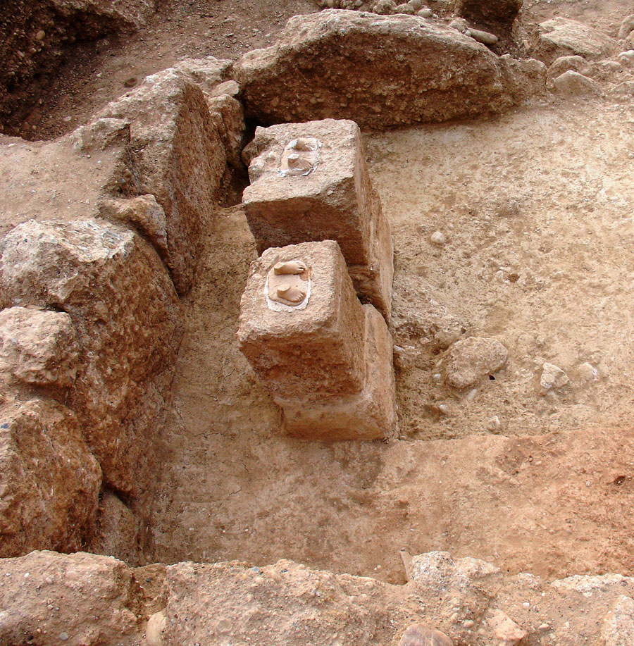 Νότια αυτής εντοπίστηκαν δύο λίθινες σαρκοφάγοι με προσανατολισμό Β-Ν. Οι όψεις τους ήταν καλυμμένες με λευκό κονίαμα. Στην πρώτη βρέθηκε ελαφρώς μετακινημένη η καλυπτήρια πλάκα. Στο εσωτερικό της σωζόταν ο σκελετός με το κρανίο στη βορειοανατολική πλευρά. Η ταφή ήταν κτερισμένη με ένα λύχνο και μία σιδερένια στλεγγίδα. Στη δεύτερη σαρκοφάγο η ταφή ήταν αναμοχλευμένη. Στη νοτιοδυτική γωνία βρέθηκε μελαμβαφής λεκανίδα με το πώμα της. Τα κτερίσματα χρονολογούνται στον 4ο αι. π.Χ.