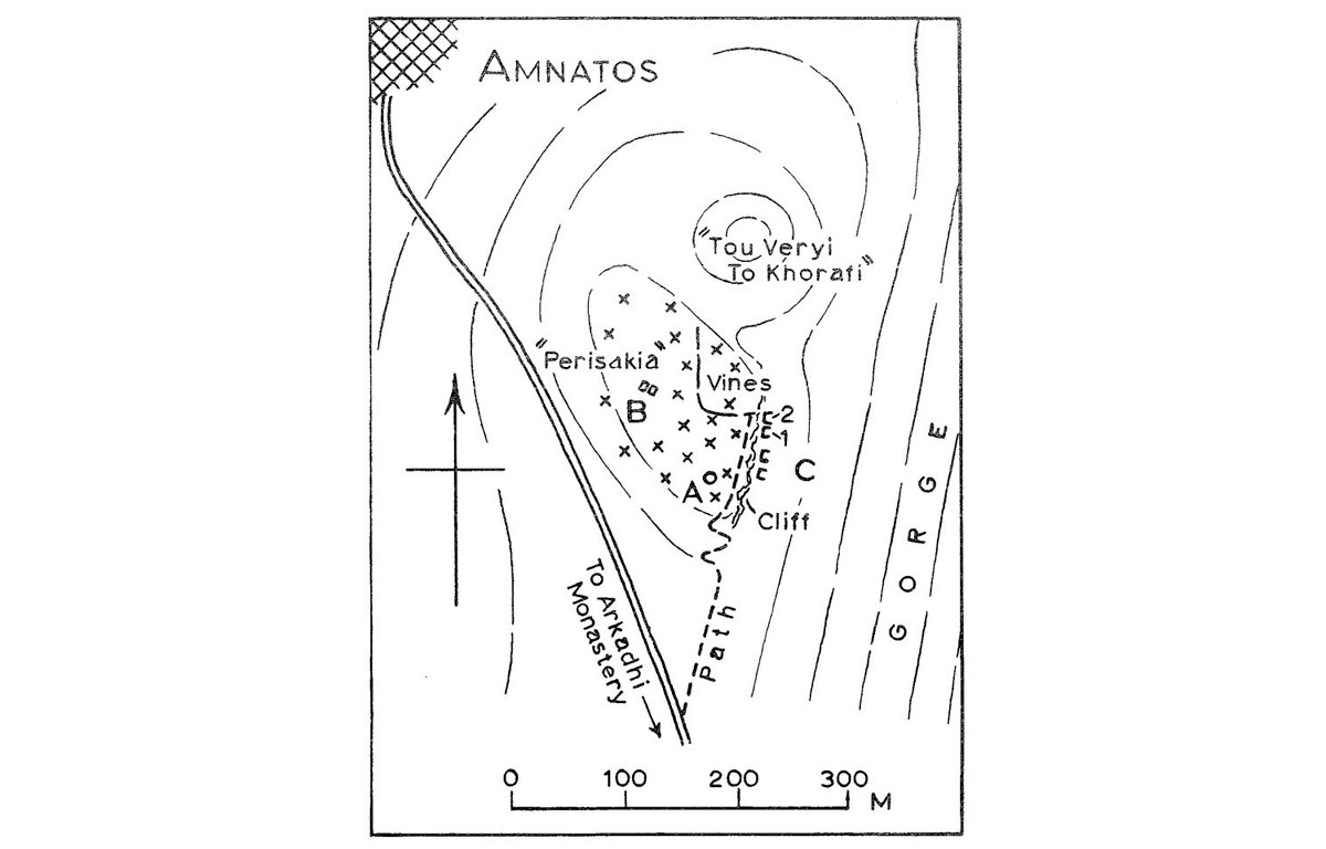Το τοπωνύμιο Αμνάτος είναι πιθανότατα προελληνικό, ενώ σε αρχαία επιγραφή απαντά το κύριο όνομα «Άμνατος» (σημ. 2). Ο περιηγητής Sieber ταυτίζει την Αμνάτο με την αρχαία πόλη «Τριπόδω» (σημ. 3), η ύπαρξη της οποίας αμφισβητείται (σημ. 4). Οι εκτεταμένοι, πάντως, λιθοσωροί (εικ. 5-7) και οι πυκνές επιφανειακές συγκεντρώσεις ελληνορωμαϊκών και κυρίως βυζαντινών οστράκων στο λόφο «Ελληνικά» ή «Περισσάκια» (σημ. 5) επιβεβαιώνουν την εντατική κατοίκηση της περιοχής, τουλάχιστον κατά τους χρόνους αυτούς. Στην κορυφή και στο νοτιοανατολικό πρανές του ίδιου λόφου είναι ακόμη και σήμερα ορατά κάποια λιγοστά, πολύ αποσπασματικής διατήρησης, αρχιτεκτονικά κατάλοιπα, καθώς και ελάχιστοι κατεστραμμένοι και συλημένοι κιβωτιόσχημοι και λαξευτοί τάφοι των ελληνορωμαϊκών πιθανότατα χρόνων (εικ. 8-11) (σημ. 6). Οι Hood, Warren και Cadogan που επισκέφθηκαν τα «Περισσάκια» στις 22 Αυγούστου 1962 εντόπισαν στο πλάτωμα του λόφου, σε μία έκταση διαστάσεων 200×100 μ., πλήθος κλασικών, ελληνιστικών, ρωμαϊκών και μεσαιωνικών οστράκων, άφθονο αρχαίο δομικό υλικό, κυρίως αδρά επεξεργασμένους δόμους και κεραμίδες, πυραμιδόσχημα υφαντικά βάρη, λίθινα εργαλεία άλεσης δημητριακών και σύνθλιψης ελαιοκάρπου, δύο πήλινα σφαιρίδια, τα οποία ερμήνευσαν ως πιθανές ενδείξεις για την ύπαρξη ιερού κάπου στη βόρεια απόληξη του λόφου, καθώς και δύο λαξευτούς ελληνορωμαϊκούς τάφους στην ανατολική παρυφή του (εικ. 12) (σημ. 7). Όταν, λίγα χρόνια μετά, ο Sanders αναζήτησε τα παραπάνω αρχαία λείψανα, αυτά είχαν ήδη καταστραφεί από την καλλιέργεια, τη συνεχή απόσπαση οικοδομικού υλικού και τις αλλεπάλληλες συλήσεις (σημ. 8).