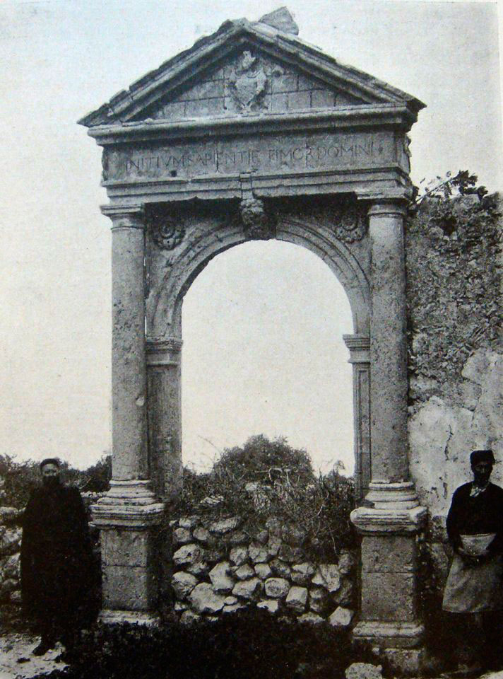 Νοτιοδυτικά της εκκλησίας του Αγίου Ιωάννη, στην πλατεία του «Βελανιδέ», υψώνεται, στεντόρειος και συνάμα βουβός μάρτυρας της ιστορίας του τόπου, η φημισμένη «Πύλη της Αμνάτου» (εικ. 15). Η πύλη έχει αετωματική επίστεψη, το τύμπανο της οποίας κοσμείται με έξεργο μονοκέφαλο αετό στραμμένο στα δεξιά, εκατέρωθεν του οποίου έχουν χαραχτεί τα γράμματα Ζ. και S. Δύο δωρικοί ημικίονες που πατούν σε πεσσούς στηρίζουν επιστύλιο με την επιγραφή «INITIUM SAPIENTI<Α>E TIMOR DOMINI»: «Αρχή Σοφίας, Φόβος Κυρίου» (εικ. 16, 17) (σημ. 18). Τα δύο τριγωνικά διάχωρα που σχηματίζονται πάνω από το τόξο της εισόδου κοσμούνται με ρόδακα ενώ το κέντρο του τόξου με λεοντοκεφαλή. Σύμφωνα με τον G. Gerola η πύλη κοσμούσε τη νοτιοανατολική πλευρά του «μεγάρου» της γνωστής βενετσιάνικης οικογένειας των Sanguinazzo καθώς ο θυρεός φέρει το έμβλημά τους (σημ. 19). Η ταυτότητα του κτιρίου στο οποίο ανήκε η πύλη εξακολουθεί, πάντως, να αποτελεί μια πρό(σ)κληση για τους ειδικούς (σημ. 20).