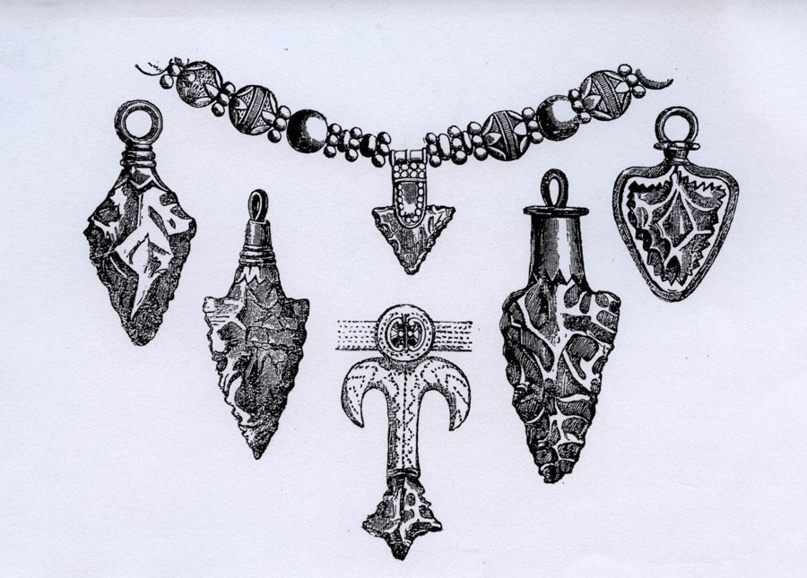 Είναι γεγονός ότι τα χαρακτηριστικότερα λίθινα εργαλεία, όπως οι αιχμές και οι πελέκεις, κινούσαν την περιέργεια των αρχαίων, οι οποίοι τα συνέλεγαν σαν κάτι το αξιοπερίεργο. Αυτό οπωσδήποτε θα συνέβαινε όταν πλέον η χρήση του σιδήρου είχε παγιωθεί και είχε χαθεί η γνώση του χρηστικού τους χαρακτήρα. Υπάρχουν πολλές ενδείξεις ότι τους προσδιδόταν ιδεολογικό περιεχόμενο και σχετίζονταν με δοξασίες ήδη από τα πρώιμα ιστορικά χρόνια (Hochstetter 1987, σ. 52) όπως συνέβαινε και με τα απολιθωμένα οστά (σημ. 11). Έτσι μπορεί να εξηγηθεί η παρουσία νεολιθικού λίθινου πέλεκυ ανάμεσα στα κτερίσματα υστερορωμαϊκής ταφής στην κεντρική Γαλλία (Corpus 1, 1999, σ. 6). Ως ανάλογο παράδειγμα μπορεί να αναφερθεί ότι σε οικία ρωμαϊκών χρόνων στην Ήλιδα βρέθηκε νεολιθικός προϊστορικός λειασμένος πέλεκυς (σημ. 12). Τα αντιπροσωπευτικότερα από αυτά, τις λίθινες αιχμές βελών και τους πελέκεις από λειασμένο λίθο, οι αρχαίοι τα ονόμαζαν «κεραύνια». Πίστευαν ότι είχαν πέσει από τον ουρανό μέσω κεραυνού και ότι ήταν αντικείμενα με μαγικές δυνάμεις (πρβλ. Πλίνιος Nat. Hist. 37, 134-135, σημ. 13). Αυτοφυής σίδηρος με τη μορφή μετεωρίτη ή «κεραυνίου» υπέστη επεξεργασία κοπής με πριονισμό, διάτρηση και λείανση, όπως οι λίθοι για την κατασκευή κοσμημάτων (πρβλ. μετεωρίτης Αγ. Τριάδας, 1600-1400 π.Χ.) (Ιακωβίδης 1970, σ. 289, εικ. 1). Πολύ χαρακτηριστικό είναι το παράδειγμα νεολιθικού λειασμένου πέλεκυ με την ακατάληπτη μαγική επιγραφή, ρωμαϊκών χρόνων, «ΑΒΡΑCΑΞ» (σημ. 14) (Θεοχάρης κ.ά. 1973, εικ. 209). Για τον ίδιο αναμφίβολα λόγο, τις αιχμές βελών κατά την Αρχαιότητα (Ετρούσκοι) και στο Βυζάντιο τις έδεναν με πολύτιμα μέταλλα και τις κρεμούσαν ως περίαπτα στα οποία απέδιδαν μαγικές προστατευτικές αλλά και αποτρεπτικές ιδιότητες (εικ. 16) (Καββαδίας 1909, σ. 18-20, εικ. 3) (σημ. 15). Δεν αποκλείεται στο λόγο αυτό να οφείλεται και η εύρεση στο νεκροταφείο των Μεγάρων λεπίδας οψιανού στη θέση της θωρακικής χώρας ενός νεκρού θαμμένου σε σαρκοφάγο δεύτερης χρήσης του 4ου-2ου αι. π.Χ. (Ζορίδης 1994, σ. 61). Ανάλογα χαρακτηριστικά παραδείγματα προέρχονται από ΠΓ θόλο στην Πύλο, όπου βρέθηκαν πολλά μικρά κομμάτια οψιανού και πυριτόλιθου (Blegen κ.ά. 1973, σ. 240). Φολίδα οψιανού προέρχεται επίσης από τον τάφο της Ίσιδος στην Ελευσίνα που χρονολογείται στη Γεωμετρική εποχή (Σκιάς 1898, σ. 107) αλλά και από μεταγενέστερο τάφο στην Πραισό της Κρήτης (Bosanquet 1904, σ. 232). Μπορεί κανείς να υποθέσει ότι ο οψιανός χρησιμοποιούνταν για ταφικές τελετές ή για τελετουργικούς λόγους, ακόμη και αν ο σίδηρος τον είχε αντικαταστήσει στις καθημερινές εργασίες.