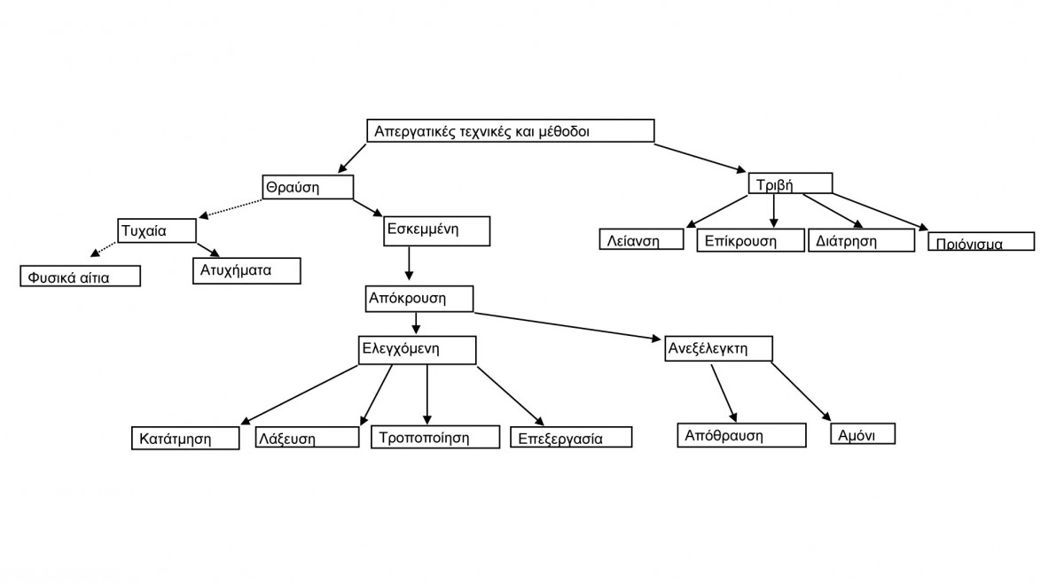 Μέθοδοι και τεχνικές χρησιμοποιήθηκαν αλληλένδετα για την κατεργασία του λίθου και συγκεκριμένα στο πλαίσιο: 1. Της απόκρουσης (σημ. 2) η οποία είναι κατά κανόνα ελεγχόμενη (σημ. 3) και αποσκοπεί α) στην κατάτμηση της πρώτης ύλης και στην παραγωγή κοφτερών μικρότερων προϊόντων (απόσπαση από πυρήνα αποκρουσμάτων και λεπίδων) με άμεση (σκληρός ή μαλακός κρουστήρας) (εικ. 3-6) ή έμμεση κρούση (παρέμβαση ενός ενδιάμεσου βελονιού από ξύλο ή ελαφοκέρατο μεταξύ του κρουστήρα και του υπό κατεργασία αντικειμένου) ή πίεση, β) στη λάξευση ενός πυρηνόμορφου εργαλείου ή στην προετοιμασία πυρήνα με κρούση ή πίεση προκειμένου, αντίστοιχα, να χρησιμοποιηθεί ή να υποστεί περαιτέρω κατάτμηση), γ) στην τροποποίηση, επέμβαση με άμεση κρούση η οποία έπεται της λάξευσης και προηγείται της οριστικής διαμόρφωσης με επεξεργασία πυρηνόμορφων εργαλείων, δ) στην επεξεργασία την οποία υφίστανται τα προϊόντα κατάτμησης, αποκρούσματα ή λεπίδες και συχνά τα υποπροϊόντα της λάξευσης, προκειμένου να διαμορφωθούν με άμεση κρούση και πίεση (σημ. 4) σε εργαλεία, 2. Της τριβής (σημ. 5), η οποία περιλαμβάνει α) τη λείανση β) την επίκρουση (σημ. 6) γ) τη διάτρηση και δ) το πριόνισμα (σημ. 7). Οι παραπάνω επεμβάσεις, πλην της κατάτμησης, αποσκοπούν στο να δώσουν μια συγκεκριμένη και προκαθορισμένη μορφή σε ένα κομμάτι πρώτης ύλης, αφαιρώντας σταδιακά μικρότερα τμήματα, τα οποία, όποια μορφή και αν έχουν (αποκρούσματα, απολεπίσματα, θραύσματα ή σκόνη), είναι, σε τελική ανάλυση, άπεργα, δηλαδή απορρίμματα της κατεργασίας, ασχέτως αν πάρα πολλές φορές η οικονομία πρώτης ύλης, η εξοικονόμηση ενέργειας ή διάφοροι άλλοι παράγοντες που σχετίζονται με την ανθρώπινη φύση (πρακτικός νους, καιροσκοπισμός, σημ. 8) υπαγόρευαν την «ανακύκλωσή» τους και τη χρήση τους όπως και τα προϊόντα κατάτμησης (πίν. 1-2).