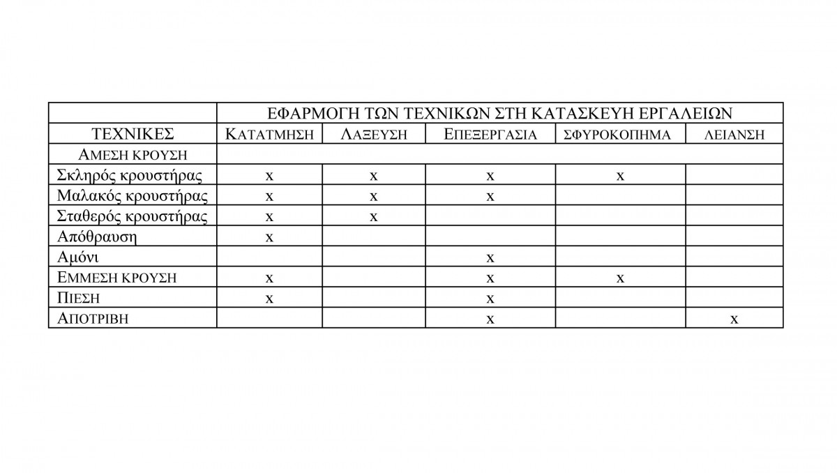 Αρκετές είναι οι μέθοδοι (σημ. 1) που εφαρμόστηκαν στο πλαίσιο των παραπάνω τεχνικών, ως επί το πλείστον στην κατεργασία εργαλείων αποκρουσμένου ή λειασμένου λίθου αλλά και άλλων υλικών (οστό, ελεφαντόδοντο) (εικ. 1). Οι μέθοδοι αυτές εφαρμόστηκαν ως επί το πλείστον στην κατασκευή εργαλείων αποκρουσμένου λίθου, διαδικασία που ανάλογα με το αποτέλεσμα μπορεί να είναι πολύπλοκη και να απαιτεί επιδεξιότητα στην εκτέλεσή της (Ματζάνας 2001β, σ. 59-60) σε αντίθεση με τις απλούστερες τεχνικές της λείανσης (εικ. 2), οι οποίες χρειάζονται, ωστόσο, περισσότερο χρόνο και προσπάθεια.