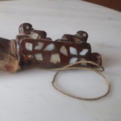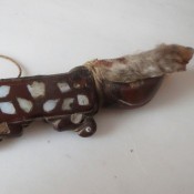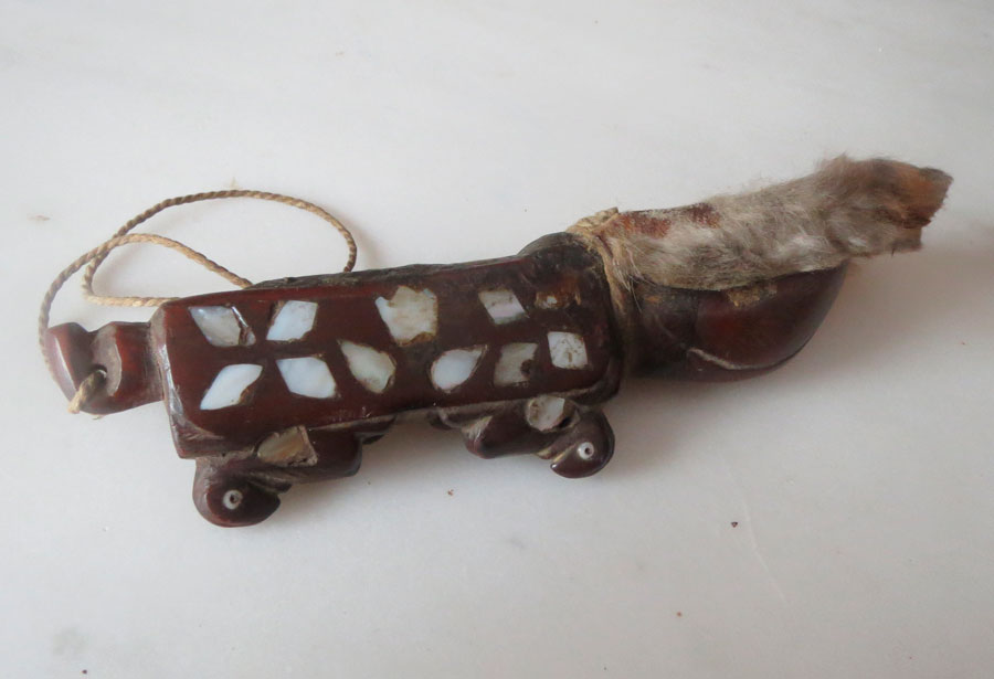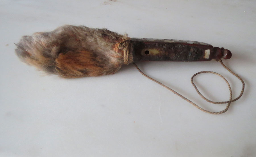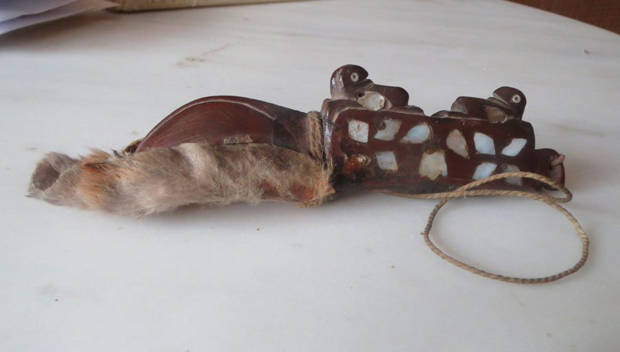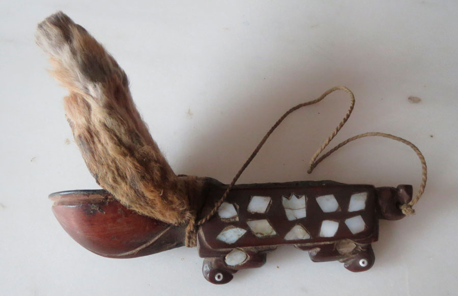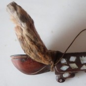 Το ξύλινο αυτό κουταλάκι, που καλύπτεται από δέρμα κουνελοπόδαρου, χρησιμοποιούσαν οι Καλάς στις γιορτές της γονιμότητας της γης, στη διάρκεια των οποίων έσπερναν σπόρους για να έχουν καλή σοδειά.