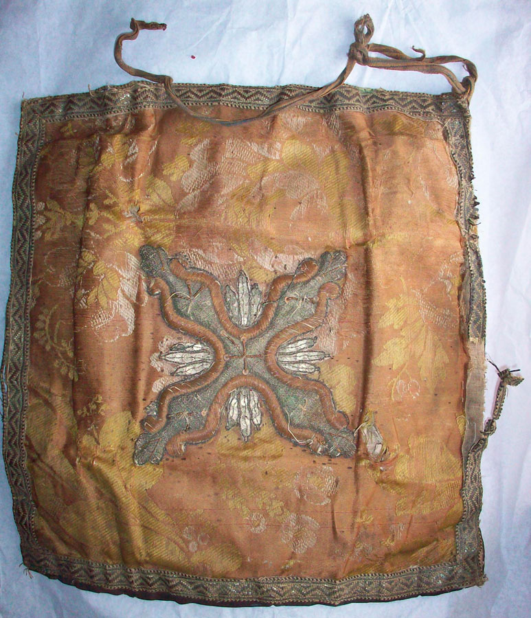 Η μεταξωτή επιφάνεια του καφεκόκκινου κάμπου καλύπτεται από μεγάλα κίτρινα ελικοειδή διακοσμητικά άνθη και καρπούς με φυσιοκρατική απόδοση (εικ. 1). Το ύφασμα φαίνεται να προέρχεται από μεγαλύτερο κομμάτι και κόπηκε για να κατασκευαστεί το επιγονάτιο.