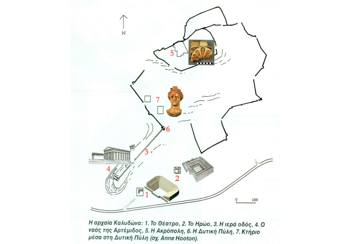 Οι σχετιζόμενες με την πόλη Καλυδώνα ανασκαφές (σημ. 9), έγιναν αφενός επί του δικόρυφου «λόφου Κουρτ-αγά» (στην ουσία δύο λόφοι «σιαμαίοι»), όπου πρωταρχικά υψώθηκε επί του υψηλότερου εξ αυτών η μυκηναϊκών χρόνων (1600-1050 π.Χ.) ακρόπολις, αλλά που στους ιστορικούς χρόνους συμπεριλήφθηκαν αμφότεροι οι «σιαμαίοι» λόφοι στον περίβολο των τειχών της αρχαίας πόλεως που περιέτρεχε και τους δύο λόφους, καστροπολιτεία γνωστή μετέπειτα με τη μεσαιωνική της επωνυμία «Κάστρο του Κουρτ-αγά». Αφετέρου, ανασκαφές έγιναν και επί του γειτνιάζοντος προς τα ΝΔ των «σιαμαίων» λόφων ετέρου λόφου όπου εγκαθιδρύθηκε το Λαφριαίον Ιερό Τέμενος. Αυτές οι ανασκαφές, καθώς και τα τυχαία ευρήματα στη γύρωθεν ευρύτερη περιοχή, αποδεικνύουν ότι η συγκεκριμένη περιοχή κατοικείται διαχρονικά: στην Πρωτοελλαδική (σημ. 10) (3200-2000 π.Χ.), στη Μεσοελλαδική (σημ. 11) (2000-1580 π.Χ.), στην Υστεροελλαδική (σημ. 12) (1580-1050), στην Πρωτογεωμετρική περίοδο (σημ. 13) (1050-900 π.Χ.), και βέβαια έκτοτε σε όλους τους αρχαίους ιστορικούς χρόνους (σημ. 14) – Γεωμετρικούς (900-700 π.Χ.), Αρχαϊκούς (700-500 π.Χ.), Κλασικούς (500-301 π.Χ.) και Ελληνιστικούς χρόνους (301-31 π.Χ.), συμπεριλαμβανομένης της Ρωμαιοκρατίας στην Ελλάδα (σημ. 15). Παρακμάζει μετά το 30 π.Χ., χρονιά που ο Οκταβιανός Αύγουστος μετοικίζει υποχρεωτικά τους κατοίκους της υποδουλωμένης στους Ρωμαίους πόλεως της Καλυδώνος στη νεοϊδρυθείσα από τον ίδιο Νικόπολη στην Ήπειρο (σημ. 16).