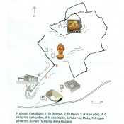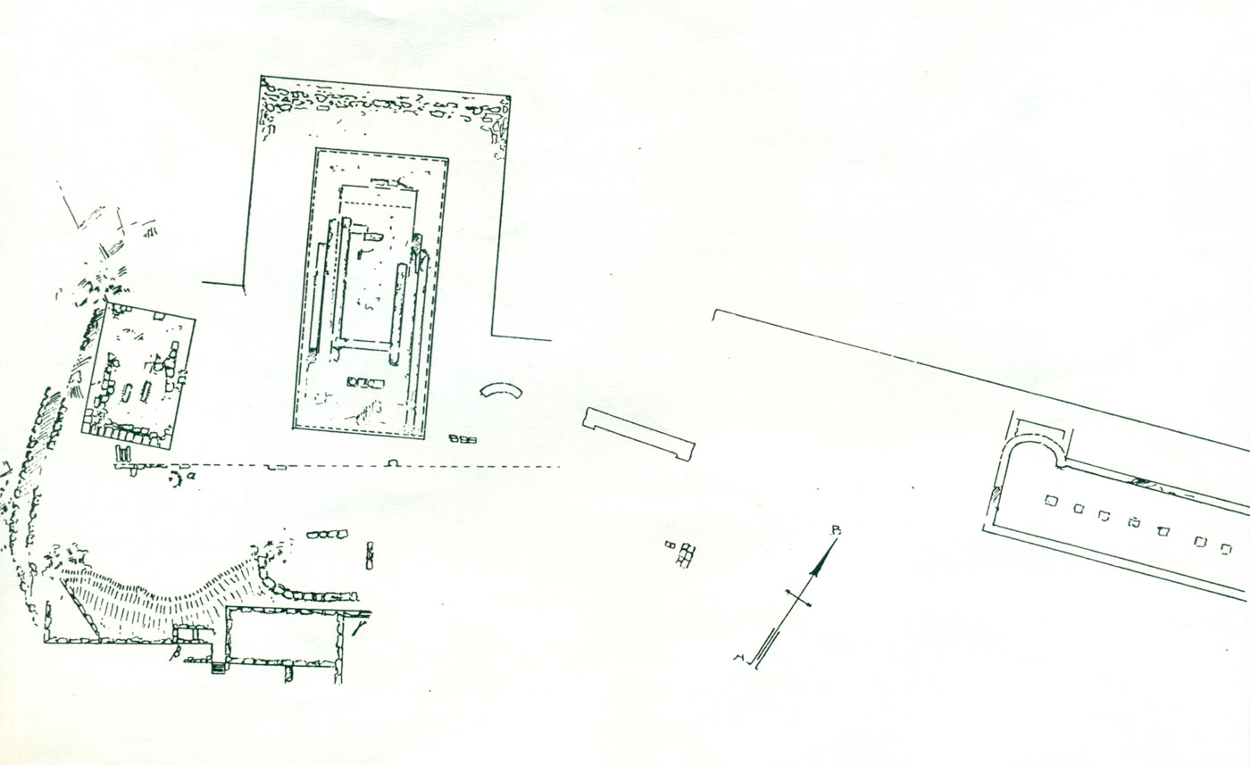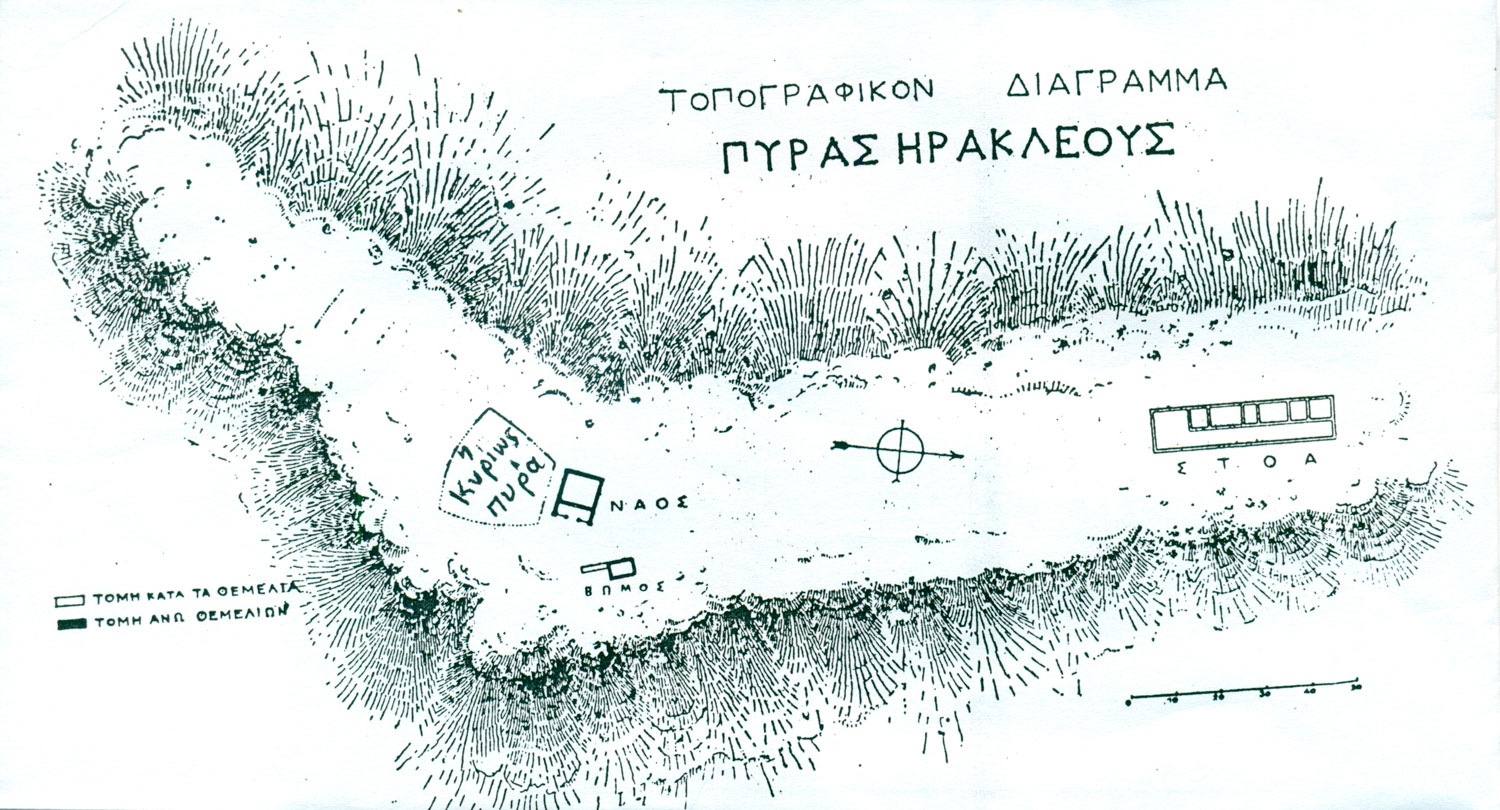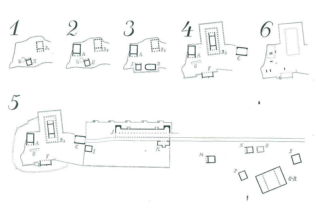 Υπόμνημα Πίνακα 2: Α: «Ναός Α» Απόλλωνος(;) ή Διονύσου(;). Β: «Ναός Β» Αρτέμιδος (τελικής φάσης του 360 π.Χ.). C: Πρόπυλον(;). D (=αψιδοειδές οίκημα με εσχάρα-βωμό στο εσωτερικό του, χρονολογούμενο υπό του Κ. Ρωμαίου στη «γεωμετρική εποχή»), E (=ορθογώνιο οίκημα/(βωμός;): Κτήρια της πρωταρχικής φάσεως ανοικοδόμησης του Λαφριαίου Ιερού, προ του 600 π.Χ. F: Στοά. Αριθμός 76: μικρή πλατεία έμπροσθεν των δύο ναών όπου θα πρέπει είτε να υπήρχαν δύο βωμοί ανά ένας έμπροσθεν εκάστου ναού, είτε να υπήρχε τουλάχιστον ο εντελώς εξαφανισθείς βωμός στον οποίον κατέληγε η ιερά οδός. Ι, Κ: Αταύτιστα κτίσματα. J: Μακρά δίκλιτη στοά (Ελληνιστικών χρόνων). L-O, S: Κτήρια-«Θησαυροί», φύλαξης των αναθημάτων-προσφορών των προσκυνητών του Ιερού.