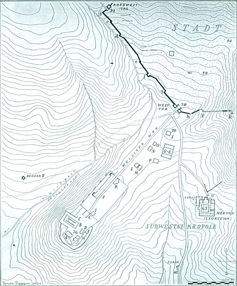 Το θέμα μας, όμως, ενδιαφέρει αυτός ακριβώς ο έμπροσθεν των δύο ναών, Αρτέμιδος και Απόλλωνος(;) «υπολειπόμενος ομαλός χώρος» (σημ. 30) που στο σχέδιο του Ε. Dyggve (σημ. 31) (βλ. εδώ, πίν. 2) ορίζεται με τον αριθμό 76, ενώ ευκρινέστατα ορίζεται στο σχέδιο του Κ. Ρωμαίου (σημ. 32) (βλ. εδώ πίν. 5. και πίν. 4 αρ. 3, 5).