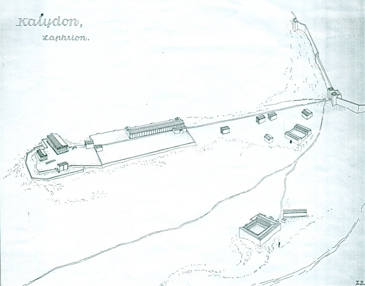 Τη δική μας έρευνα ενδιαφέρει μόνο η πόλις Καλυδών των πρωτοϊστορικών (Υστεροελλαδικών/ Μυκηναϊκών,1580-1050 π.Χ) χρόνων και των ιστορικών χρόνων (Γεωμετρική περίοδος κ.εξ.), και ειδικά το ιδρυμένο εκτός των τειχών της πόλεως, επί λόφου έξωθεν της ΝΔ πύλης, ιερό τέμενος της πόλεως αυτής, το γνωστό με το αφιερωματικό του δηλωτικό ως Λαφριαίον, ή ως Λάφριον, ή ως Λόφριον (σημ. 1) (πίν. 2, 3). Η κύρια λατρευομένη θεότητα, κατά τους ιστορικούς χρόνους, όπως δηλώνεται στις επιγραφές, ήταν η Άρτεμις Λαφρία (σημ. 2). Αλλά βρέθηκε (non in situ) σ’ αυτό το Λαφριαίο Ιερό άλλη μία ορόσημη επιγραφή του 6ου π.Χ. αι.: Κατά την ανάγνωση του Fr. Poulsen γράφει: ΑΠΟΛΟΝΟΣ ΛΑΦΡΙΟ, αλλά κατά την ανάγνωση του Κ. Ρωμαίου γράφει: ΑΠΟΛΟΝΟΣ ΛΟΦΡΙΟ (σημ. 3). Η τελευταία αυτή επιγραφή, ως ορόσημη, αποδίδεται στον έτερο μικρό «ναό Α» αφιερωμένο, κατά την επικρατούσα εκδοχή, στον Απόλλωνα(;), χτισμένον παράπλευρα του μνημειώδους «ναού Β» της Λαφρίας Αρτέμιδος (πίν. 2, 3). Αλλά κατ’ άλλους αυτός ο μικρός «ναός Α» αποδίδεται στον Διόνυσο(;).