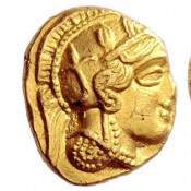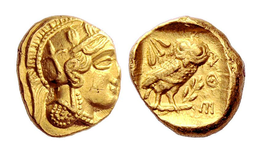 Αρχικά οι Αθηναίοι χρησιμοποίησαν το περίβλημα των επτά από τα οκτώ χρυσά αγάλματα Nικών, βάρους δύο ταλάντων το καθένα, καθώς και άλλα αναθήματα που βρίσκονταν στην Aκρόπολη, προκειμένου να εκδώσει χρυσά νομίσματα το 407/6 π.X. Τα νομίσματα αυτά κόπηκαν σε έξι υποδιαιρέσεις –στατήρας ή δίδραχμο, δραχμή (εικ. 3), ημίδραχμο, διώβολο, οβολός και ημιωβόλιο–, οι οποίες είχαν τους ίδιους τύπους και βάρος με τα αντίστοιχα νομίσματα σε άργυρο αλλά με δωδεκαπλάσια αξία, αφού η σχέση χρυσού-αργύρου εκείνη την εποχή ήταν 1 προς 12. Η έκδοση μιας πλήρους σειράς ονομαστικών αξιών σε χρυσό, καταδεικνύει ότι οι συγκεκριμένες κοπές δεν αποτέλεσαν μόνον ένα μέσο για να ρευστοποιηθεί μια μεγάλη ποσότητα πολύτιμου μετάλλου, αλλά προορίζονταν να χρησιμοποιηθούν σε ποικίλες και διαφορετικής κλίμακας συναλλαγές στην Αθήνα.