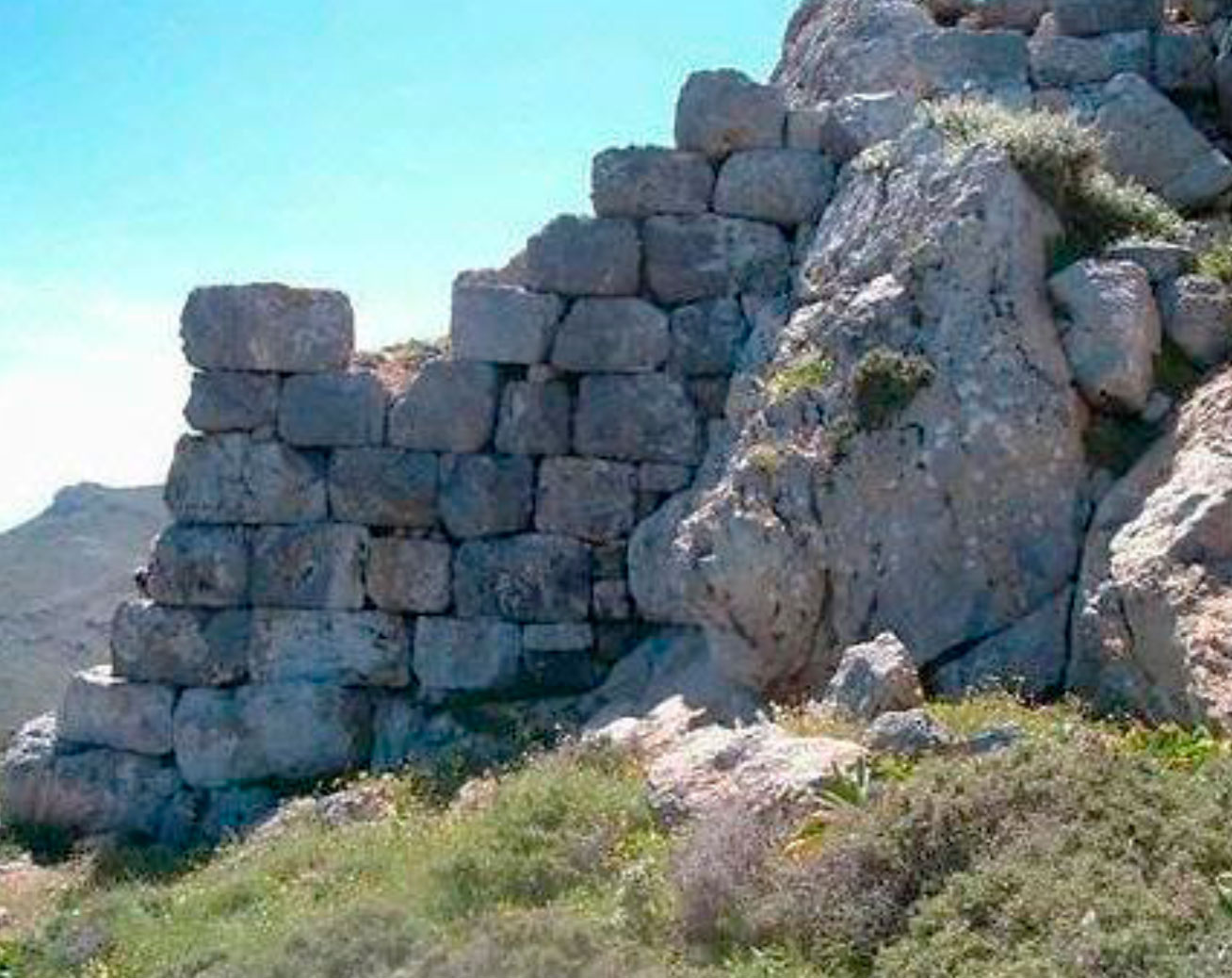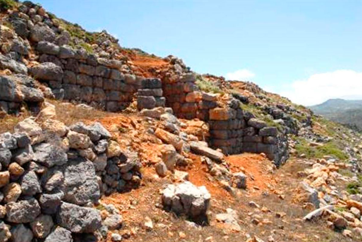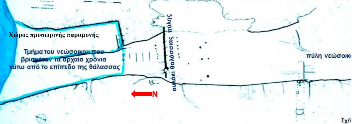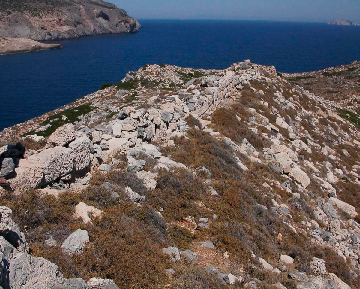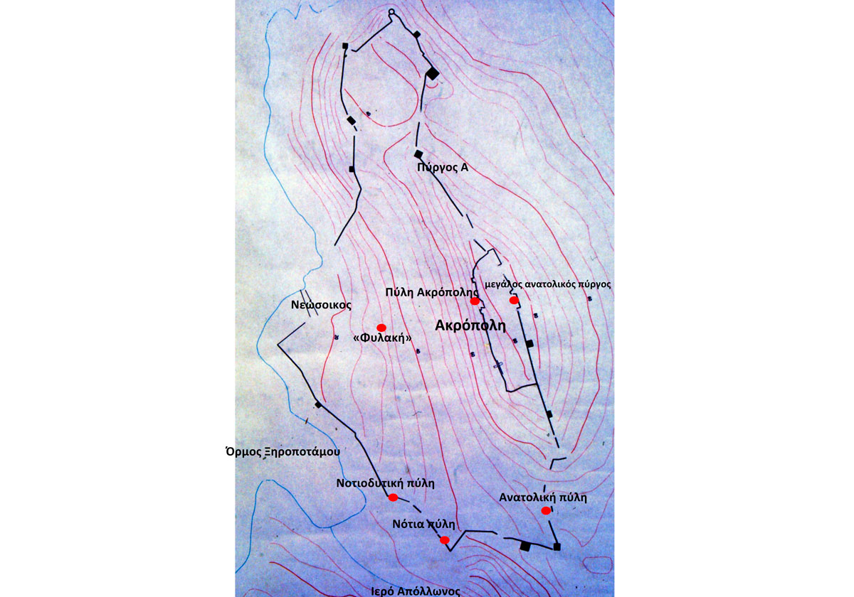 Το τείχος κάλυπτε όλη τη δυτική πλαγιά της χερσονήσου, από τη βραχώδη παραλία στα δυτικά και βόρεια έως την κορυφογραμμή προς τα ανατολικά (εικ. 19). Στο υψηλότερο σημείο μια δεύτερη γραμμή οχύρωσης περιόριζε το διοικητικό κέντρο της πόλης, την «Ακρόπολη». Στην Ακρόπολη βρισκόταν και η οικία του «ηγέτη» της πόλης προστατευμένη από τον ισχυρό βράχο που υψωνόταν στα ανατολικά της (εικ. 20), ενώ η πύλη της «Ακρόπολης» προς την πόλη ήταν και αυτή μνημειώδης, αλλά φαίνεται ότι από την αρχή της λειτουργίας της είχε καταστραφεί από εξωτερική επίθεση και η αποκατάστασή της έγινε με διαφορετικό σχέδιο (εικ. 21).